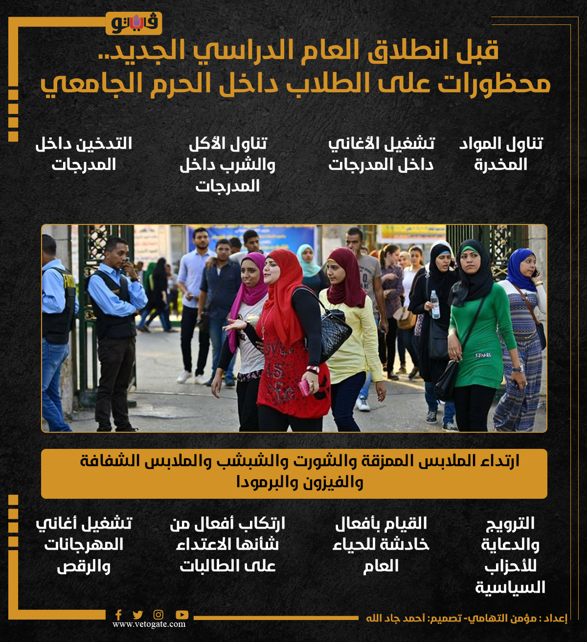 قبل انطلاق العام الدراسي الجديد.. محظورات على الطلاب داخل الحرم الجامعي (انفوجراف) الثلاثاء 10/سبتمبر/2024 - 10:43 ص 9/10/2024 10:43:01 AM الجامعات المصرية،فيتو - مؤمن التهامي شارك طباعة 18 حجم الخط شارك طباعة الحرم الجامعي الدعاية للاحزاب المجلس الأعلى للجامعات العام الدراسي الجديد الشماريخ خدش الحياء العام