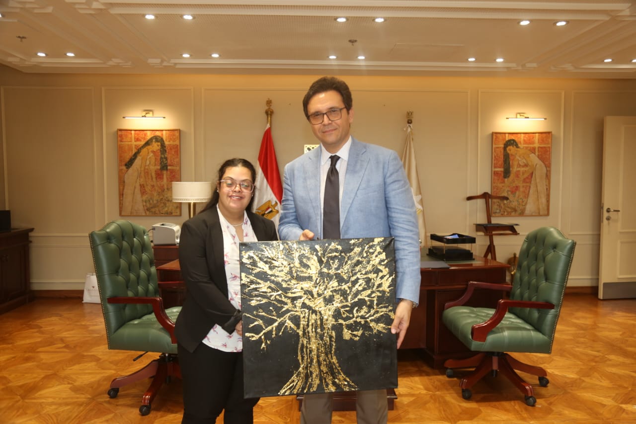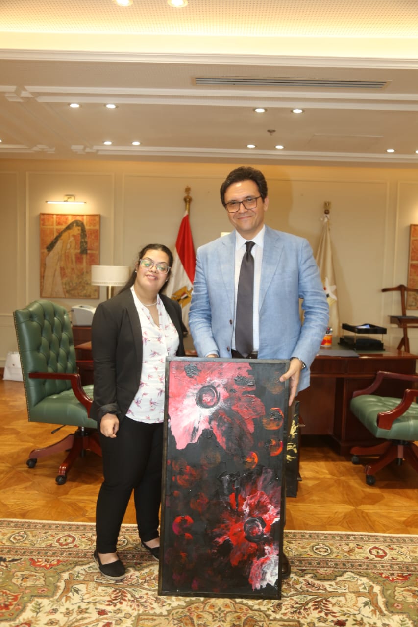 استقبل الدكتور أحمد فؤاد هنو، وزير الثقافة، الفنانة التشكيلية مريم وجيه، في مكتبه بالعاصمة الإدارية الجديدة، حيث هنأها على نجاح معرضها الأول الذي أقيم الشهر الماضي بقاعة "صلاح طاهر" بدار الأوبرا المصرية، وهو أول معرض كامل مخصص لفنانة من ذوي الهمم.