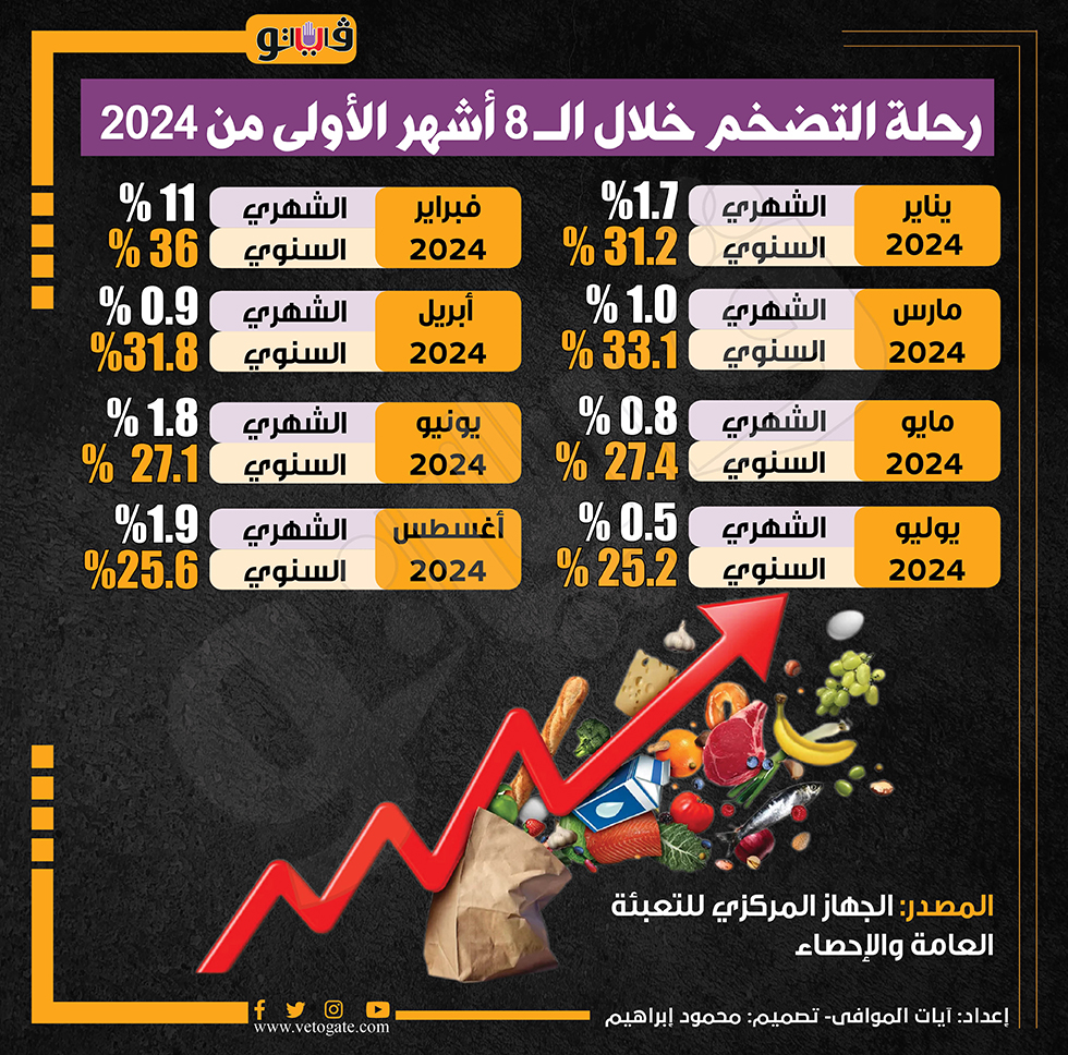 رحلة التضخم خلال الـ 8 أشهر الأولى من 2024 (إنفوجراف) الثلاثاء 10/سبتمبر/2024 - 05:41 م 9/10/2024 5:41:19 PM صورة أرشيفية آيات الموافى شارك طباعة 18 حجم الخط شارك طباعة الجهاز المركزى للتعبئة العامة والإحصاء التضخم الشهري التضخم