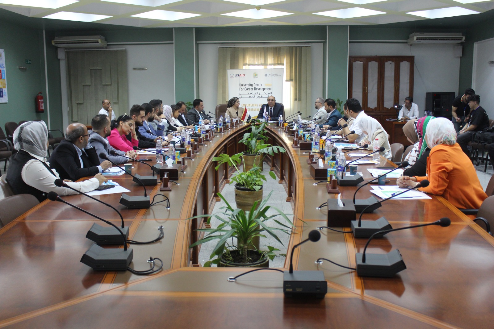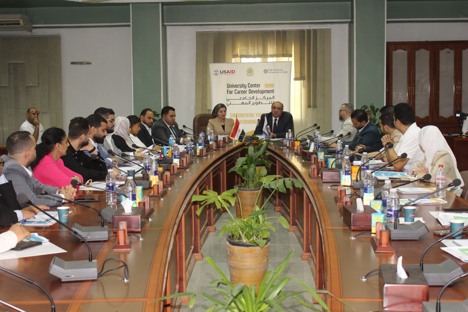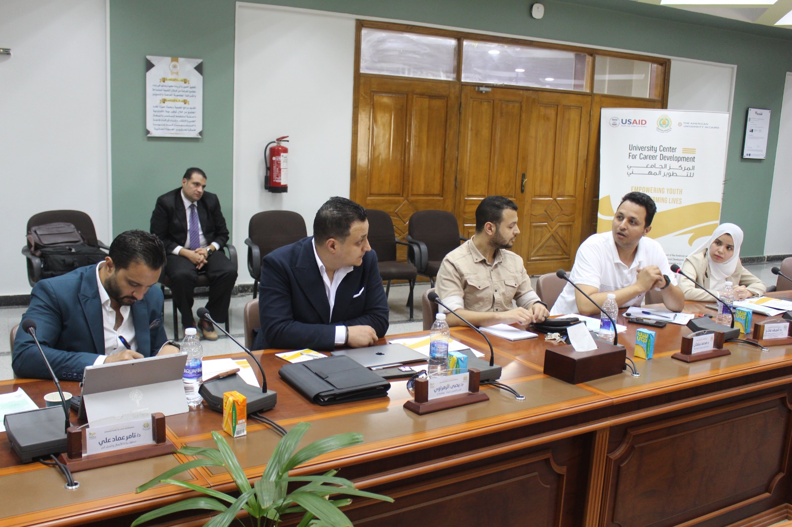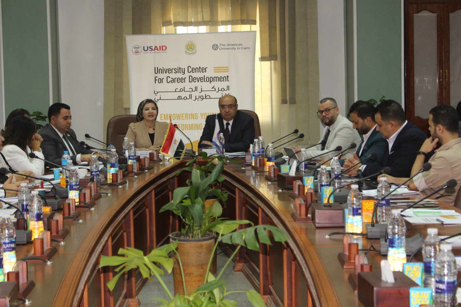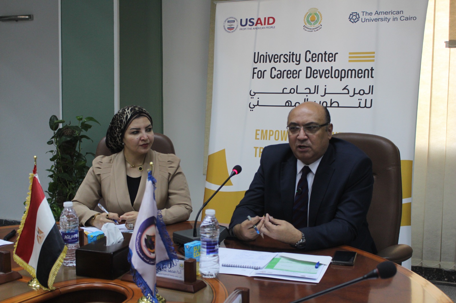 في البداية، أكّد الدكتور محمد عطية البيومى نائب رئيس الجامعة لشئون التعليم والطلاب أن رسالة الجامعة الأسمى هو بناء الإنسان في المقام الأول، فيرى أن التوظيف جزء من رؤية الجامعة لذلك البناء، مُعظّمًا الدور الذي تقوم به المراكز الجامعية للتطوير المهني لدعم الطلاب والخريجين، والتي تقدم حقائب تدريبية متنوعة لرفع المهارات الشخصية والوظيفية للطلاب والخريجين على حد السواء لربط خريج التعليم العالي بسوق العمل، موضحًا أن حرصه من عقد وحضور مثل تلك الجلسات النقاشية هو الاستماع للمتخصصين في كافة المجالات، والاستعانة بالخبرات العملية للشركات للاطلاع على كل ما هو جديد في سوق العمل ومتطلباته المتجددة كي تتمكن الجامعة من إنتاج خريج مؤهل يُناسب احتياجات ذلك السوق.
