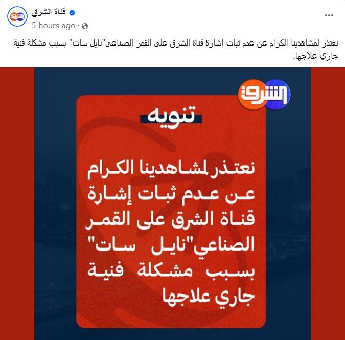 من جانبها، قالت قناة "الشرق" التي يملكها الهارب أيمن نور في بيان: “نعتذر لمشاهدينا الكرام عن عدم ثبات إشارة قناة الشرق على القمر الصناعي بسبب مشكلة فنية جار علاجها”.