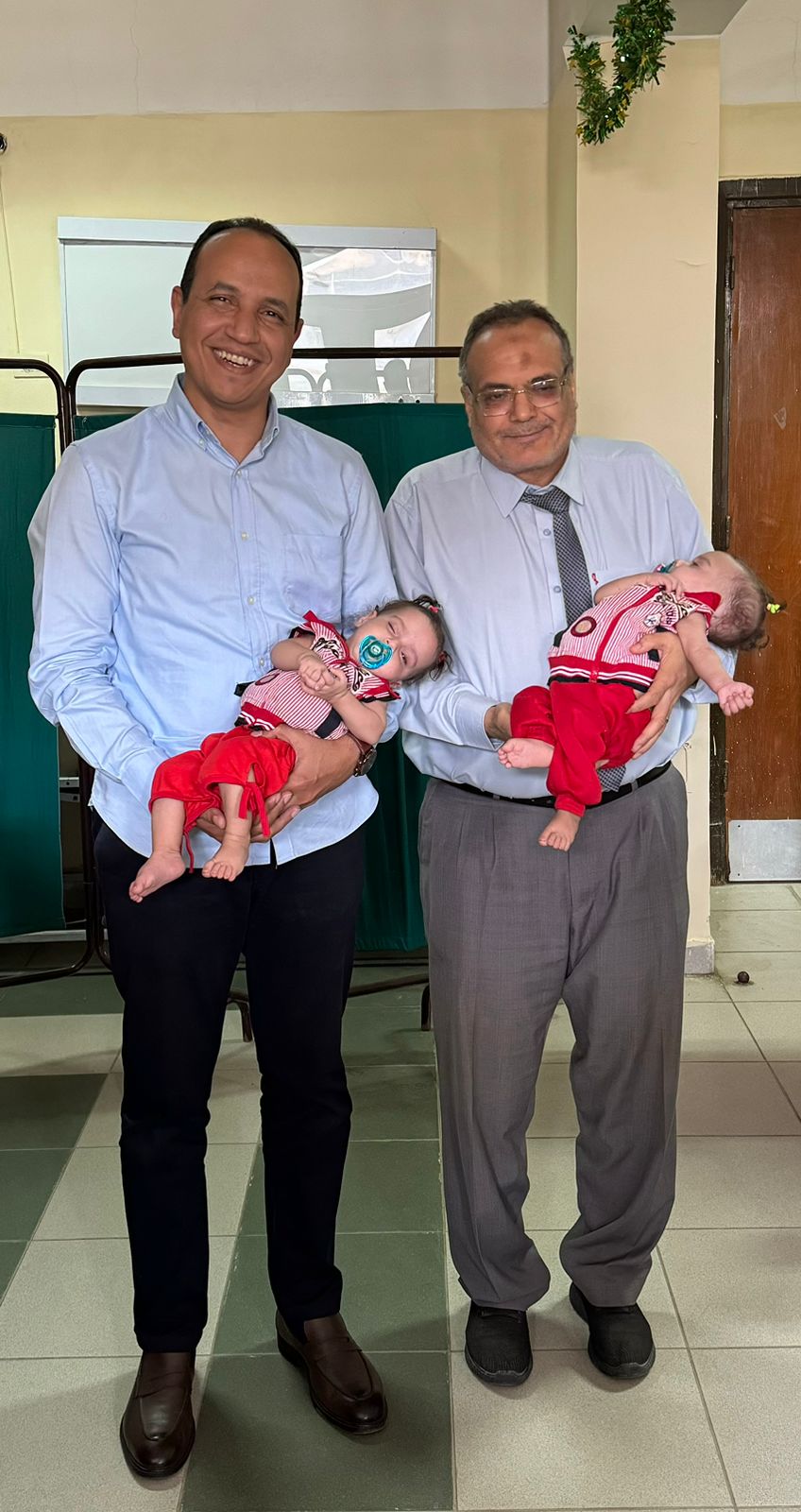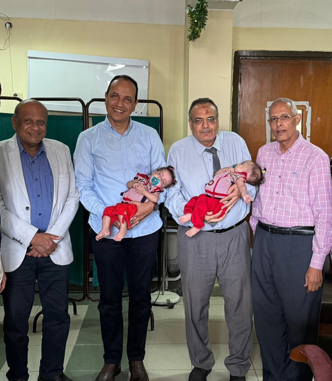 قام بمتابعة الحالة وتقديم الرعاية الطبية الكاملة للطفلتين، الأستاذة الدكتورة عزة الطيب أستاذ طب الأطفال، والدكتور محمد صلاح أحمد نائب طب وعناية الأطفال، والدكتورة إسراء عاطف شحاتة نائب الأطفال، والدكتورة جيهان محمد جلال نائب طب الأطفال، وتم خروج الطفلتين من المستشفى بحالة جيدة جدًّا.