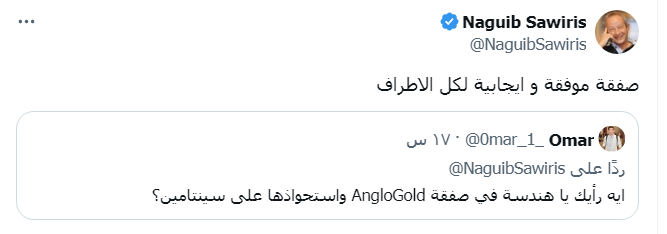 وجاء ذلك ردًا على أحد متابعيه، الذي سأل نجيب ساويرس عن رأيه في صفقة استحواذ "أنجلو جولد أشانتي" على شركة "سينتامين" للسيطرة على منجم السكري.