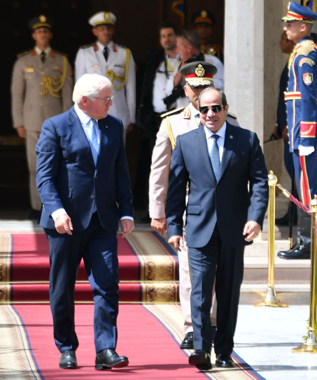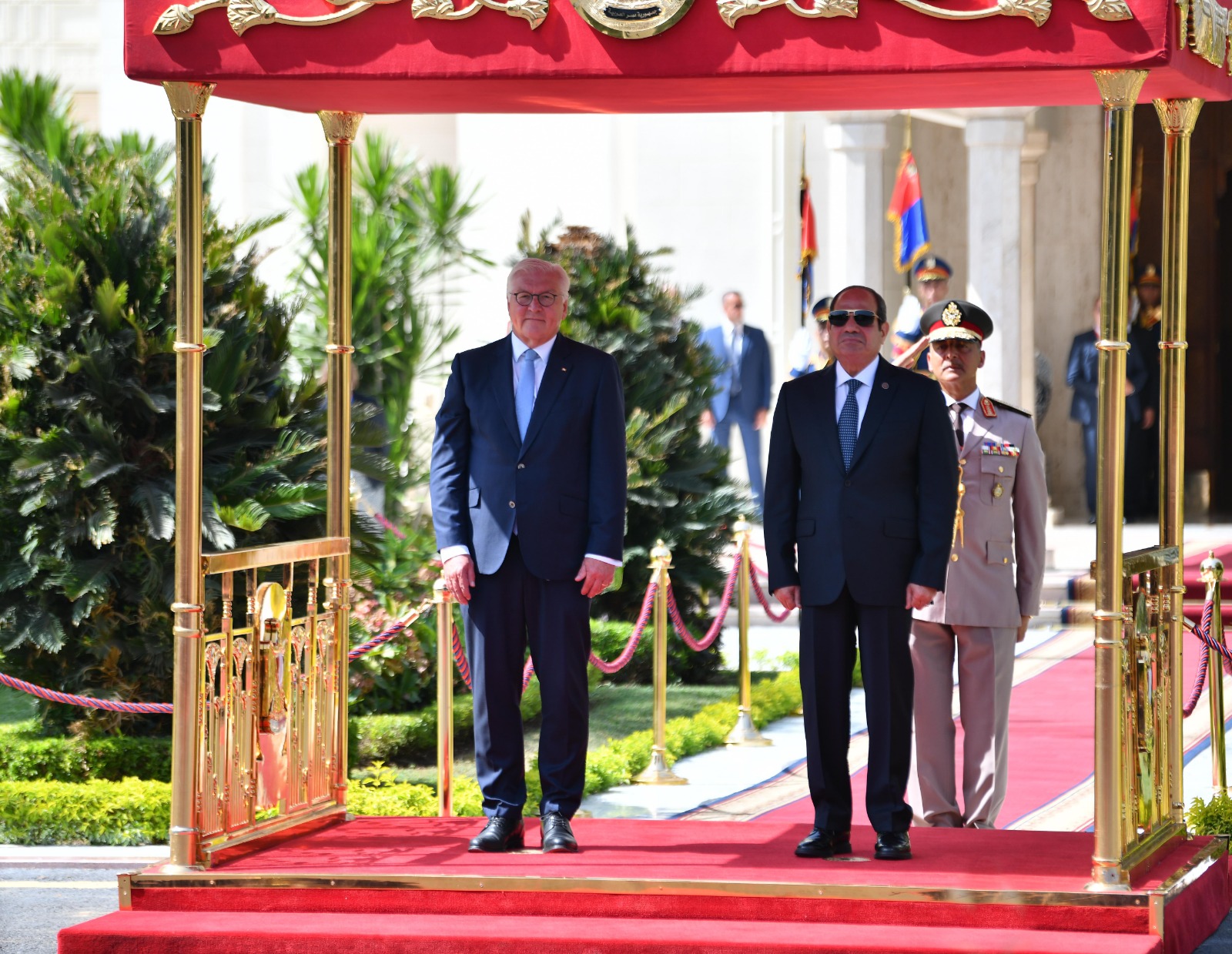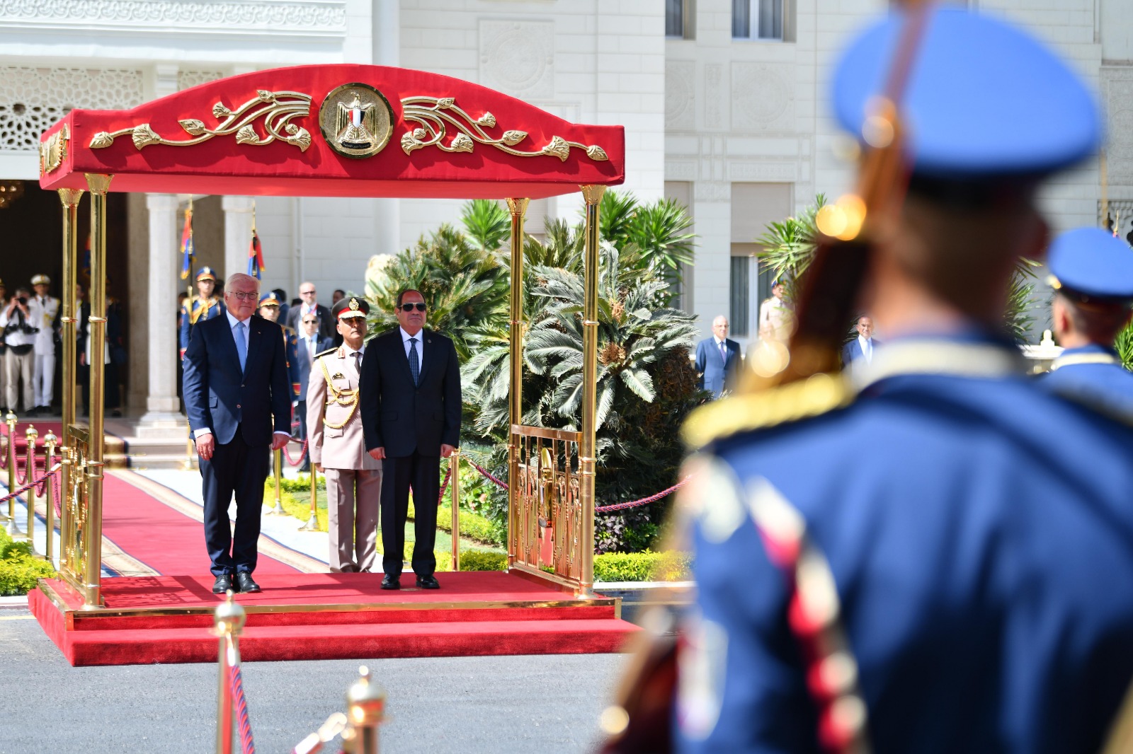 استقبل الرئيس عبد الفتاح السيسي، اليوم بقصر الاتحادية بالقاهرة، رئيس ألمانيا الاتحادية "فرانك فالتر شتاينماير"، الذي يقوم بزيارة رسمية لمصر برفقة وفد موسع من رؤساء كبرى الشركات الألمانية، حيث أُجريت مراسم الاستقبال الرسمي وتم عزف السلامين الوطنيين.