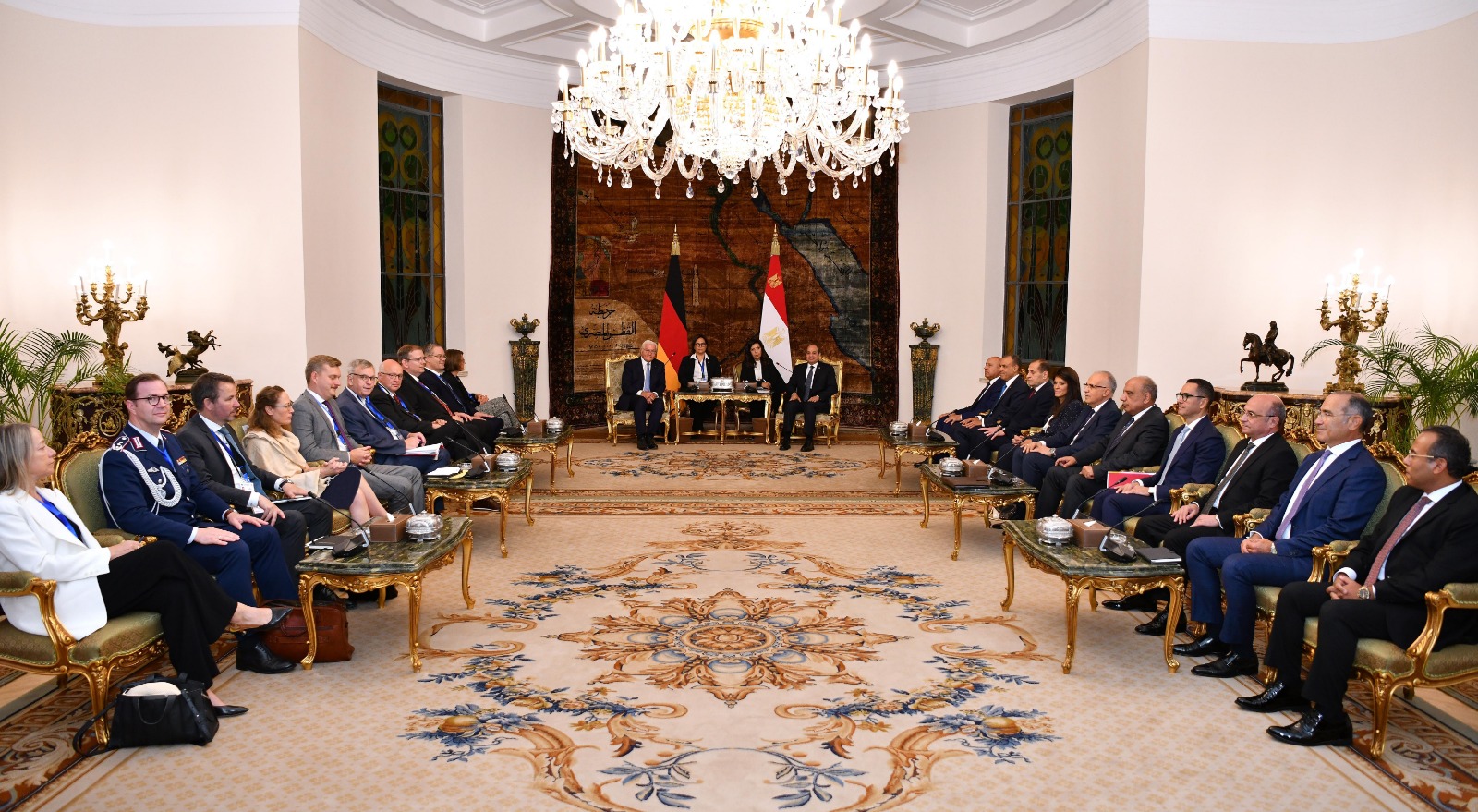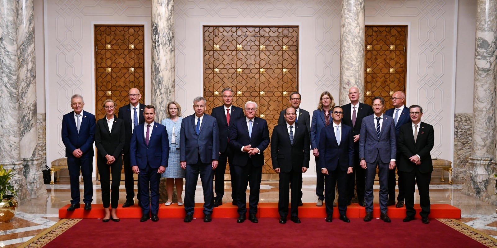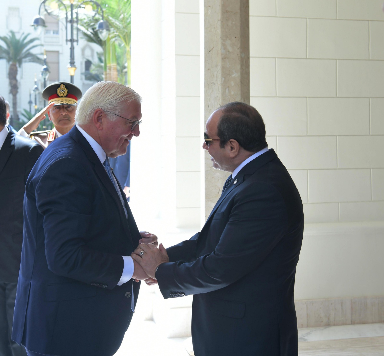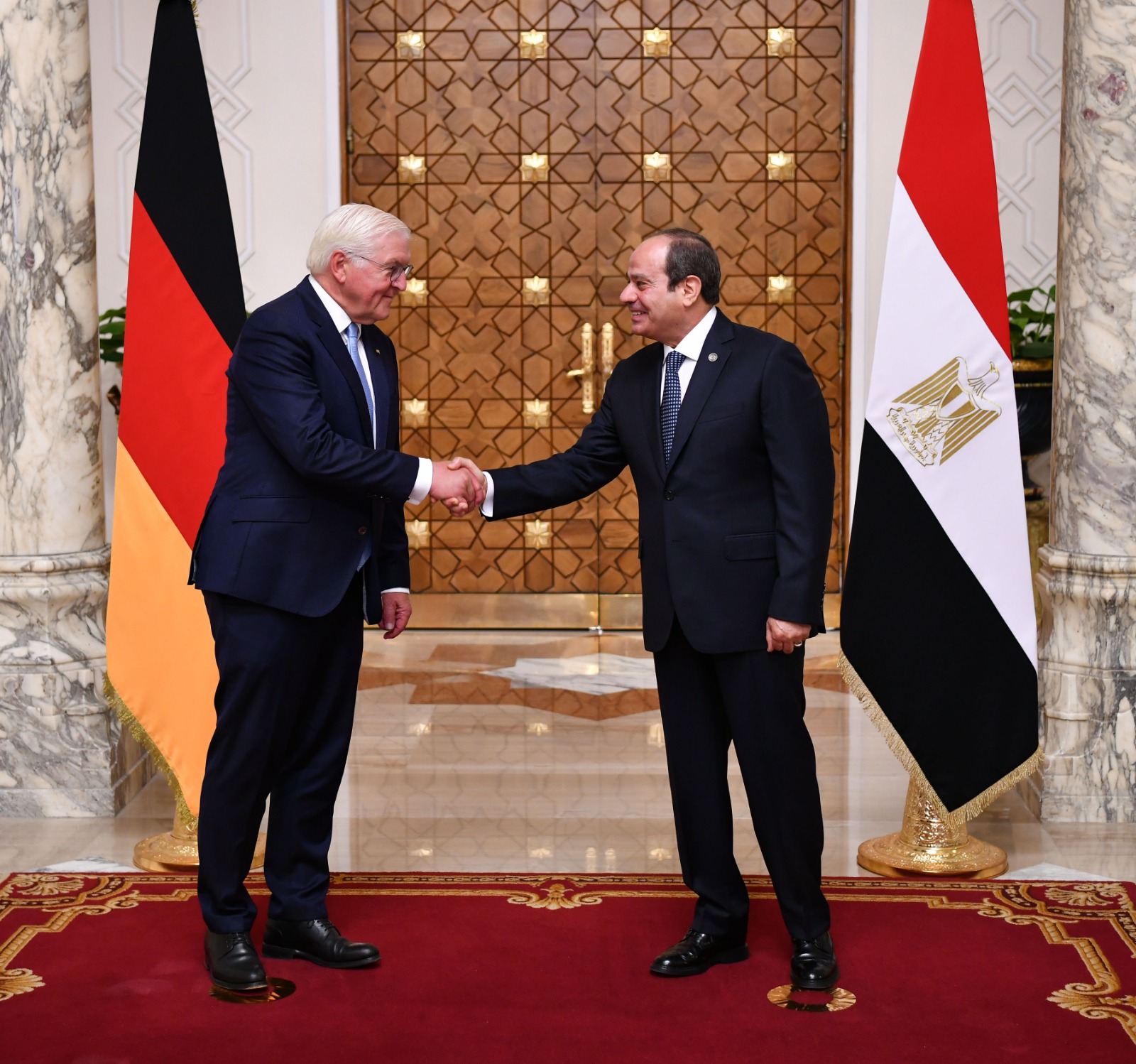 استقبل الرئيس عبد الفتاح السيسي، اليوم بقصر الاتحادية بالقاهرة، رئيس ألمانيا الاتحادية "فرانك فالتر شتاينماير"، الذي يقوم بزيارة رسمية لمصر برفقة وفد موسع من رؤساء كبرى الشركات الألمانية، حيث أُجريت مراسم الاستقبال الرسمي وتم عزف السلامين الوطنيين.
