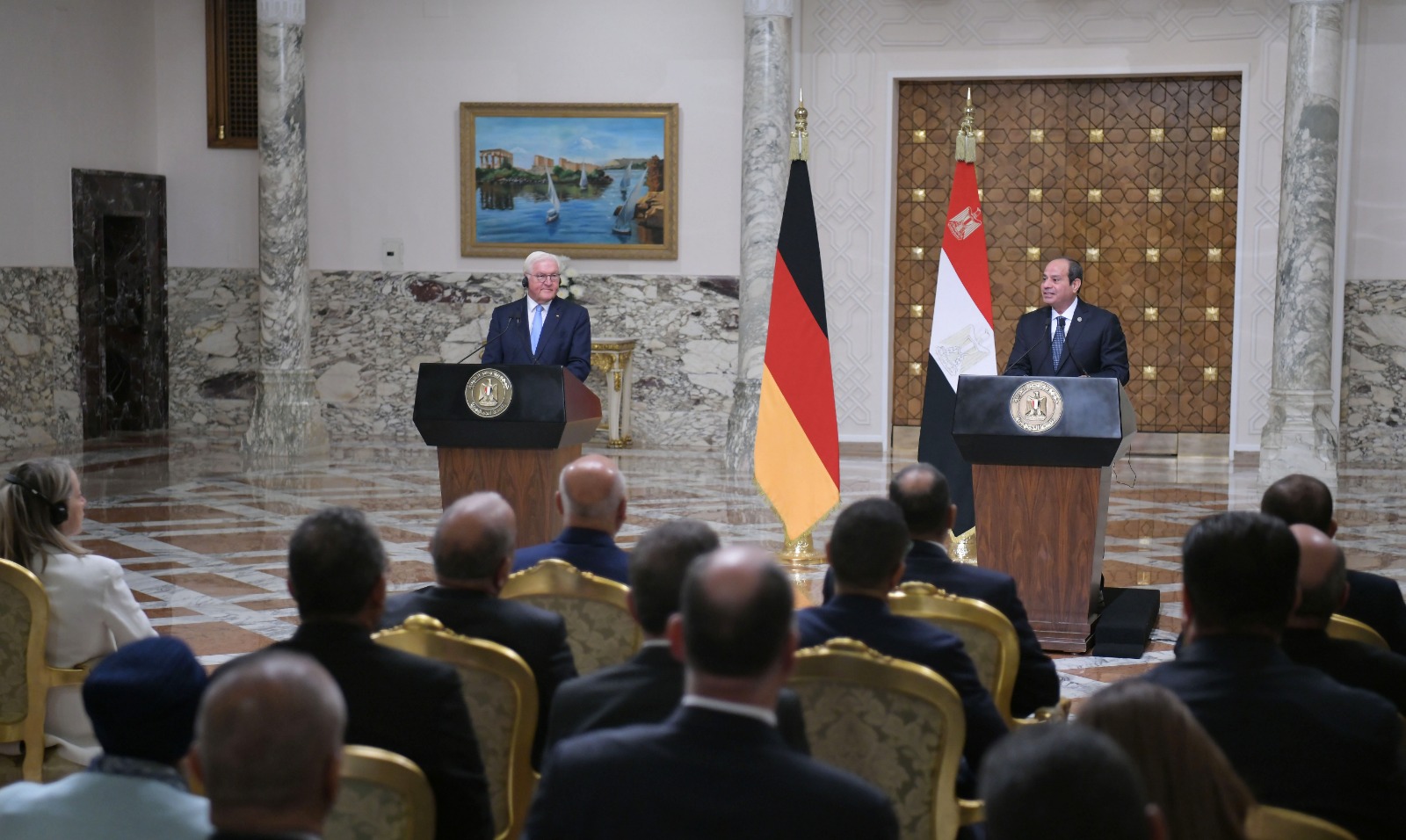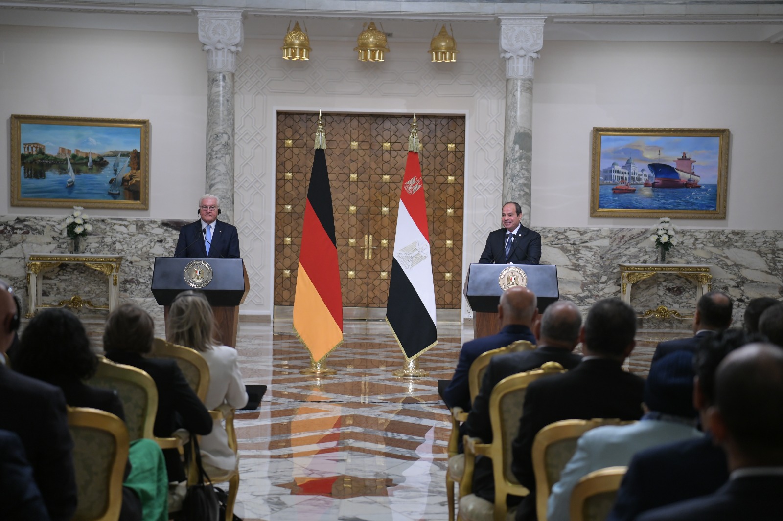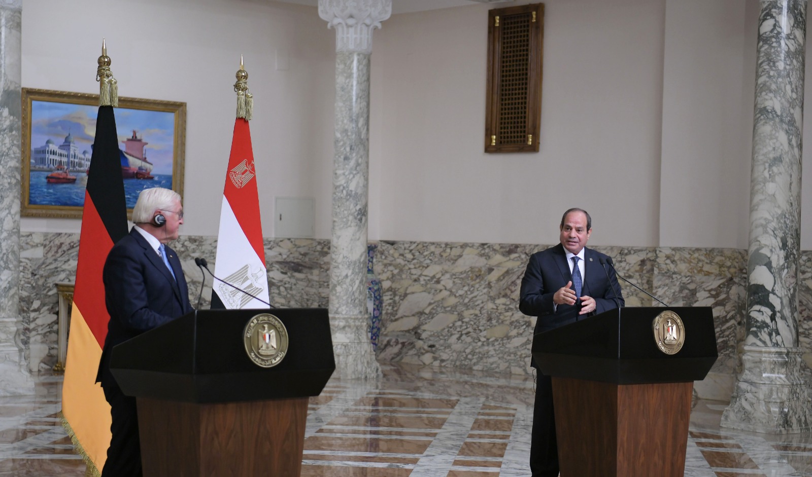 ومن جانبه، أعرب الرئيس الألماني عن اعتزاز بلاده بمصر قيادة وشعبًا، مشددًا على حرص بلاده على مواصلة تعزيز علاقاتها مع مصر في مختلف المجالات، بما فيها العمل التنموي والاستثماري، وفي قطاعات الطاقة والهجرة ومكافحة الإرهاب، فضلًا عن الدفع بالتعاون العلمي والثقافي الممتد بين البلدين، ومعربًا في هذا الصدد عن سعادته بافتتاح الجامعة الألمانية الدولية بالعاصمة الإدارية الجديدة، وكذا حرصه على اصطحاب وفد من رؤساء كبرى الشركات الألمانية خلال زيارته الجارية لمصر، وتفقده لعدد من مواقع العمل والإنتاج التي تنخرط فيها شركات ألمانية، تعمل جنبًا إلى جنب مع شركات وعمال مصريين يتسمون بالمهارة والكفاءة.