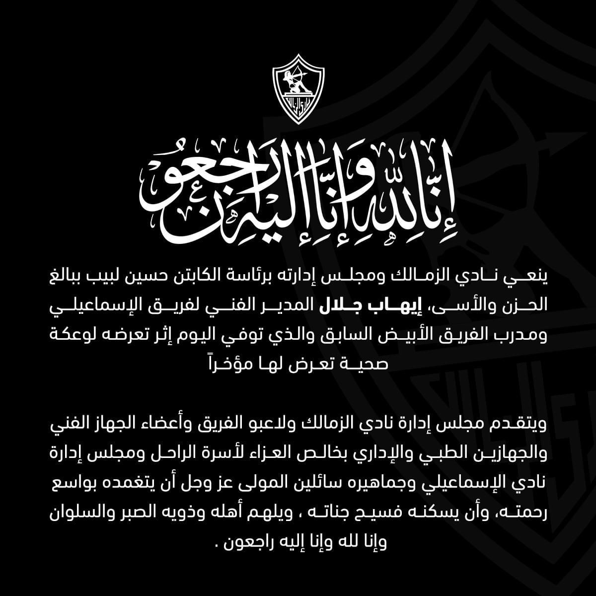 نعى نادي الزمالك ومجلس إدارته برئاسة الكابتن حسين لبيب ببالغ الحزن والأسى، إيهاب جلال المدير الفني الحالي لفريق الإسماعيلي ومدرب الفريق الأبيض السابق والذي توفي اليوم إثر وعكة صحية تعرض لها مؤخرًا.