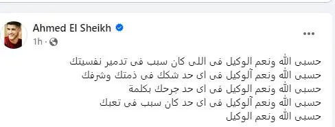 ونشر أحمد الشيخ تدوينة عبر حسابه الرسمي على موقع "فيسبوك"، دعا فيها على من اتهمهم بـ"التشكيك في ذمته وشرفه ودمروا نفسيته".