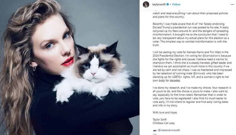وحقق "بوست" المغنية الأمريكية الشهيرة تايلور سويفت على حسابها في إنستجرام الذي أعلنت فيه أخيرًا موقفها لداعم للمرشحة الديمقراطية في الانتخابات الأمريكية، كامالا هاريس، نحو 10 ملايين إعجاب.