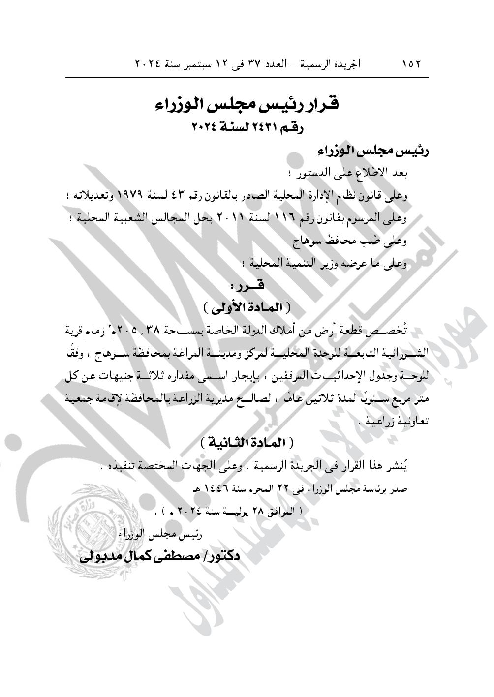 -قرار رئيس مجلس الوزراء رقم 2431 لسنة 2024، بشأن تخصيص قطعة أرض من أملاك الدولة الخاصة بمساحة 205٫38 متر، زمام قرية الشورانية التابعة للوحدة المحلية لمركز ومدينة المراغة بمحافظة سوهاج، وفقا للوحة وجدول الإحداثيات المرفقين، بإيجار اسمى مقداره ثلاثة جنيهات عن كل متر مربع سنويًا لمدة ثلاثين عامًا، لصالح مديرية الزراعة بالمحافظة لإلقامة جمعية تعاونية زراعية.
