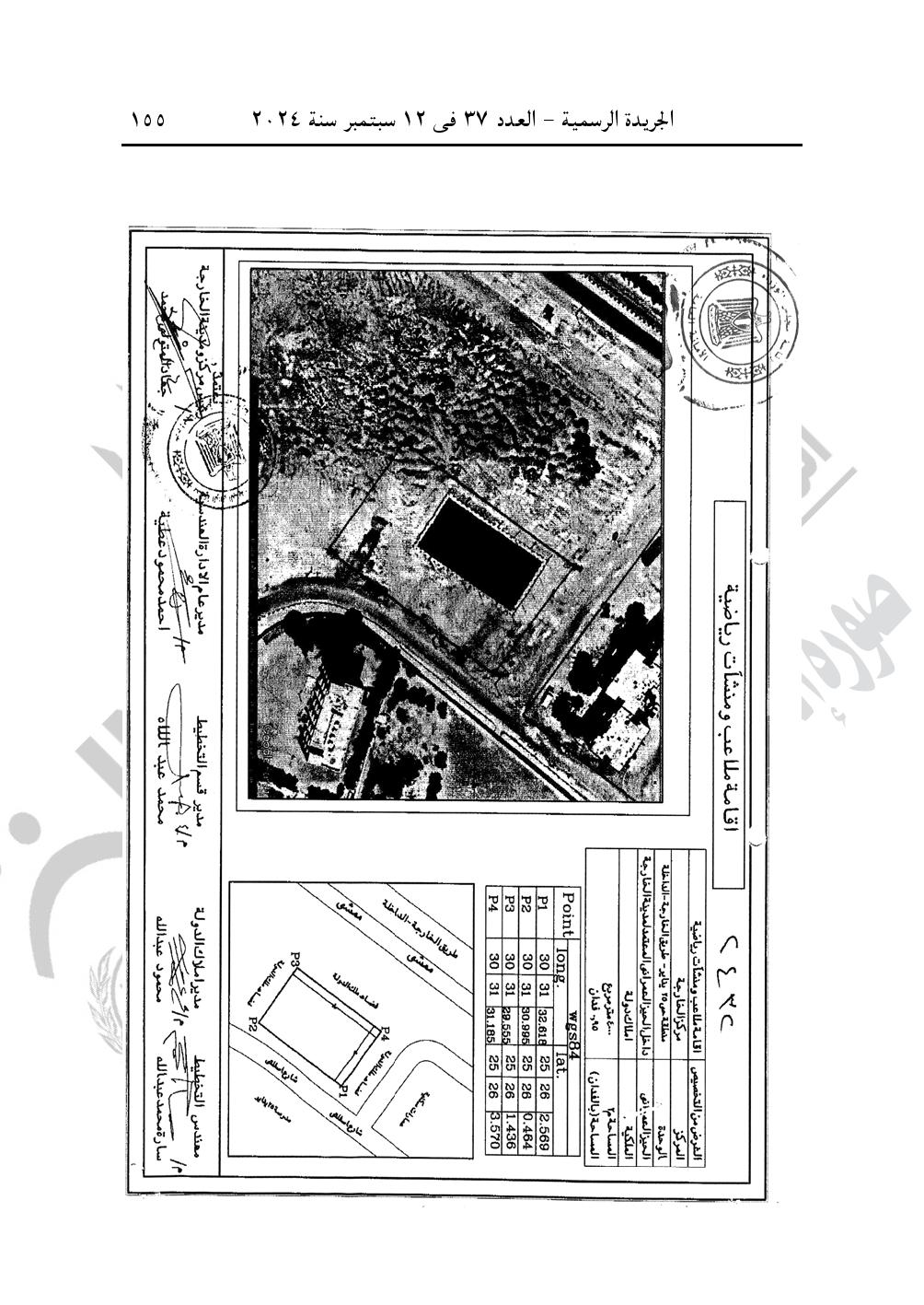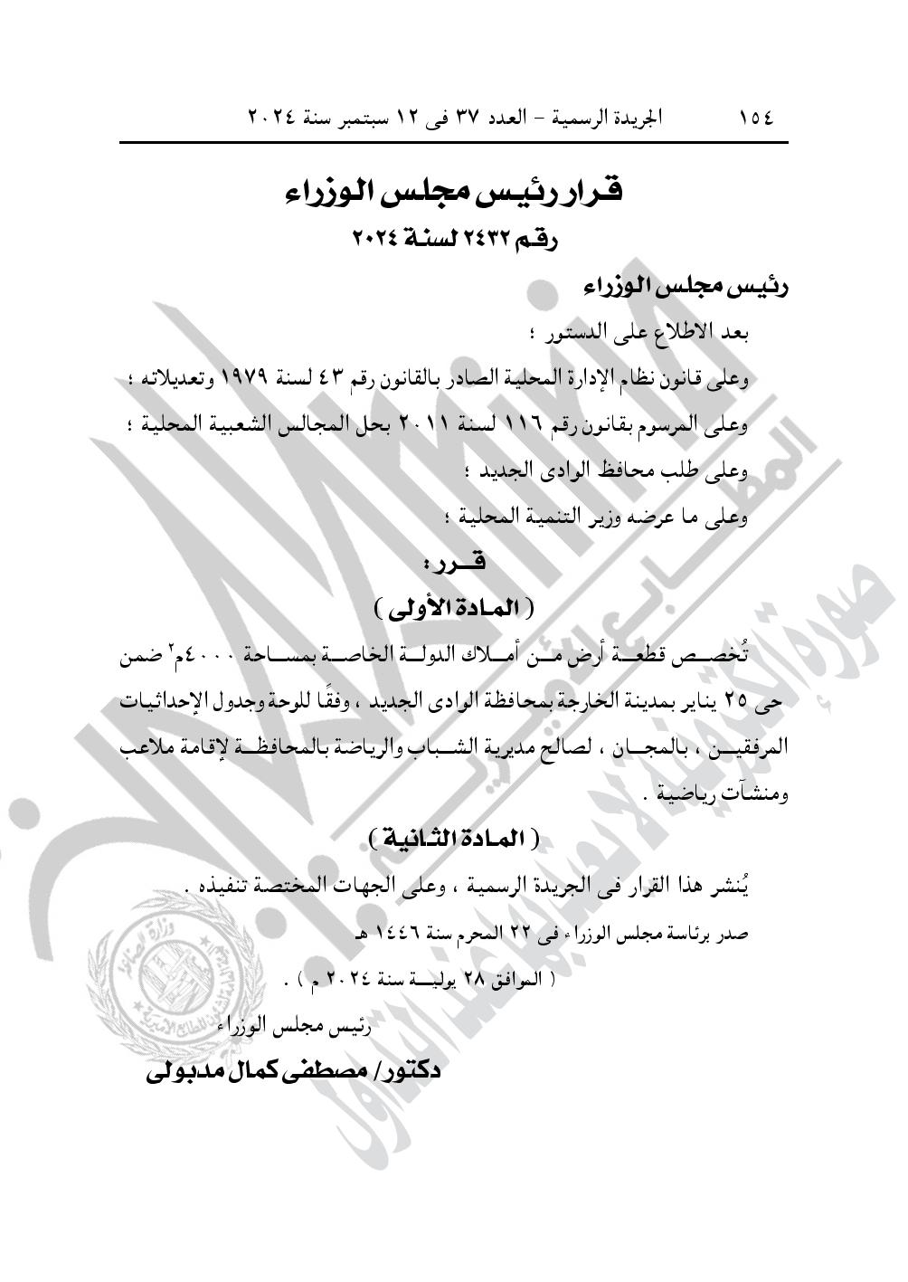 -قرار رئيس مجلس الوزراء رقم 2432 لسنة 2024، بشأن تخصيص قطعة أرض من أملاك الدولة الخاصة بمساحة 4000 متر مربع، ضمن حى 25 يناير بمدينة الخارجة بمحافظة الوادى الجديد، وفقا للوحة وجدول الإحداثيات المرفقين، بالمجان، لصالح مديرية الش باب والرياضة بالمحافظة لإقامة ملاعب ومنشآت رياضية.