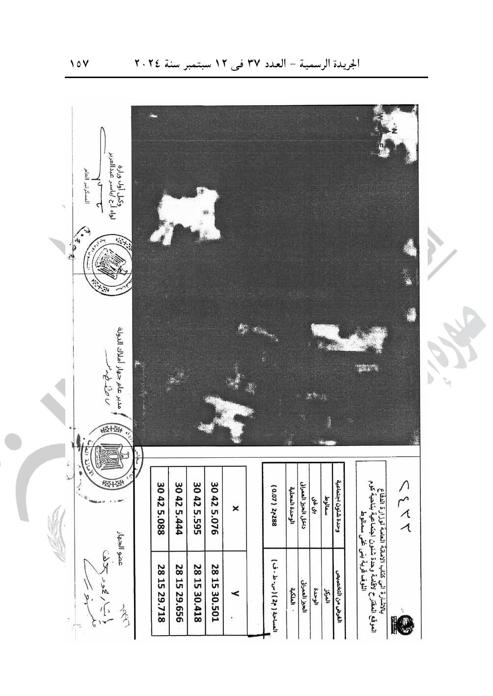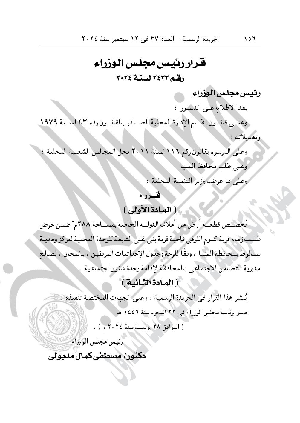 -قرار رئيس مجلس الوزراء رقم 2433 لسنة 2024، بتخصيص قطعة أرض من أملاك الدولة الخاصة بمساحة 288 متر مربع، ضمن حوض طلب زمام قرية كوم اللوفى ناحية قرية بنى غنى التابعة للوحدة المحلية لمركز ومدينة سمالوط بمحافظة المنيا، وفقا للوحة وجدول الإحداثيات المرفقين، بالمجان، لصالح مديرية التضامن الاجتماعى بالمحافظة لإقامة وحدة شئون اجتماعية.