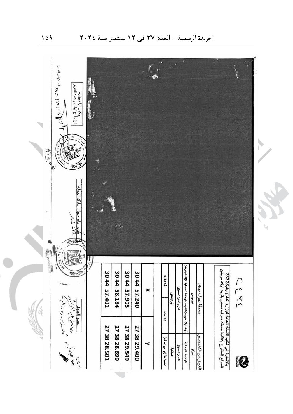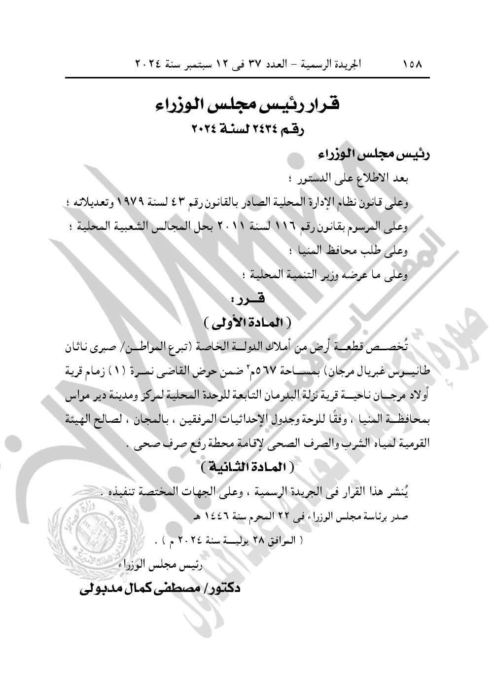 -قرار رئيس مجلـس الـوزراء رقم 2434 لسنة 2024، بشأن تخصيص قطعة أرض من أملاك الدولة الخاصة، تبرع المواطن صبرى ناثان طانيوس غبريال مرجان، بمساحة 567 متر مربع، ضمن حوض القاضى نمرة (1) زمام قرية أولاد مرجان ناحية قرية نزلة البدرمان، التابعة للوحدة المحلية لمركز ومدينة دير مواس بمحافظة المنيا، وفقًا للوحة وجدول الإحداثيات المرفقين، بالمجان، لصالح الهيئة القومية لمياه الشرب والصرف الصحى لإقامة محطة رفع صرف صحى.