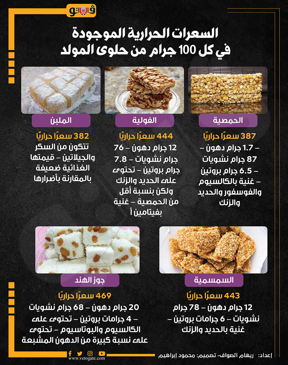 السعرات الحرارية الموجودة في كل 100 جرام من حلوى المولد (انفوجراف) السبت 14/سبتمبر/2024 - 09:00 م 9/14/2024 9:00:25 PM حلوى المولد ريهام الصواف شارك طباعة 18 حجم الخط شارك طباعة أسعار حلوى المولد النبوي 2024 أضرار الإفراط في تناول حلوى المولد اصناف جديدة من حلويات المولد السعرات الحرارية فى حلوى المولد السعرات الحرارية في الملبن السعرات الحرارية في حلويات المولد