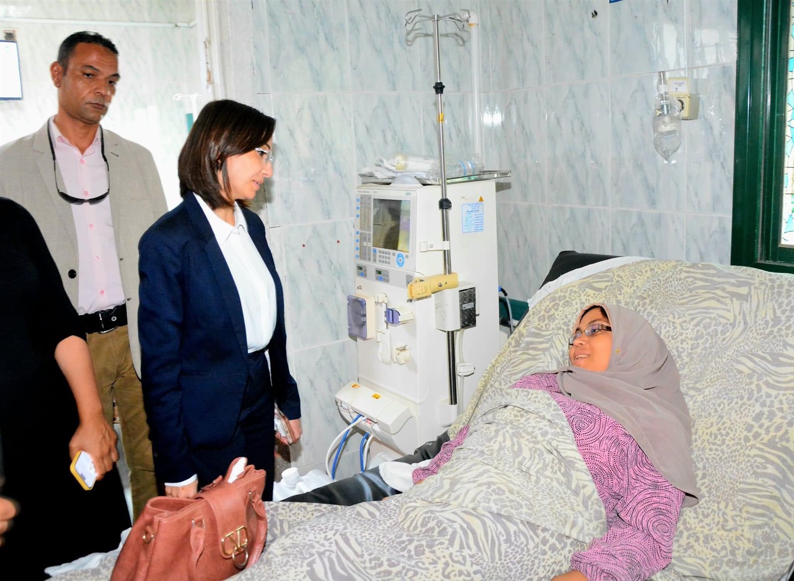 حيث قامت المحافظ خلال جولتها بتفقد قسم الغسيل الكلوي، لفحص شكوى المرضى بتوقف جلسات الغسيل الكلوي منذ صباح اليوم نتيجة عدم توافر المياه اللازمة لإجراء الجلسات