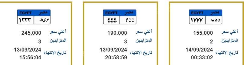 ويتنافس بعض المواطنين على بعض اللوحات من أبرزها؛ لوحة معدنية "د ه ب 1777" بسعر 155 ألف جنيه ويتنافس عليها شخصين، لوحة معدنية "ن ن م 444" بسعر 190 ألف جنيه ويتنافس عليها 3 أشخاص، ولوحة معدنية مميزة "س ى ف 1333" ويتنافس عليها 245 ألف جنيه ويتنافس عليها 3 أشخاص.
