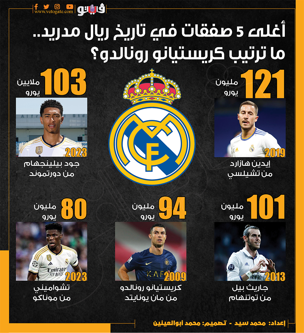أغلى 5 صفقات في تاريخ ريال مدريد.. ما ترتيب كريستيانو رونالدو؟ (إنفوجراف) الجمعة 13/سبتمبر/2024 - 03:02 م 9/13/2024 3:02:39 PM كريستيانو رونالدو، فيتو محمد سيد شارك طباعة 18 حجم الخط شارك طباعة ريال مدريد كريستيانو رونالدو هازارد رونالدو بيلينجهام جاريث بيل تشواميني