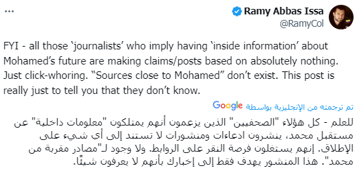 وقال رامي عباس في تغريدة عبر حسابه الشخصي على منصة "إكس": "كل هؤلاء الصحفيين الذين ينشرون ضمنًا أن لديهم معلومات داخلية حول مستقبل محمد صلاح يقدمون منشورات لا تستند إلى أي شيء على الإطلاق".