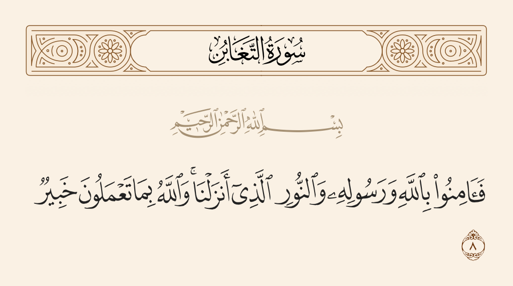 قال تعالى: (فَآمِنُوا بِاللَّهِ وَرَسُولِهِ وَالنُّورِ الَّذِي أَنزَلْنَا ۚ وَاللَّهُ بِمَا تَعْمَلُونَ خَبِيرٌ).