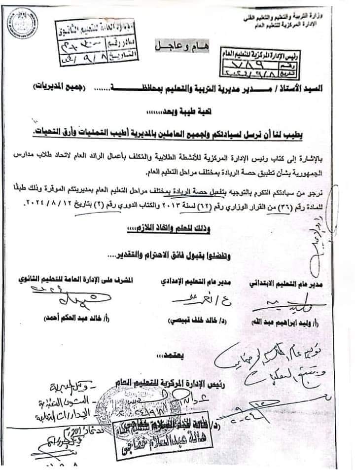 ونبهت وزارة التربية والتعليم في خطابها على ضرورة تفعيل حصة الريادة بمختلف مراحل التعليم العام بالمديريات وفقا للمادة 26 من القرار الوزاري رقم 62 لسنة 2013 والكتاب الدوري رقم 2 بتاريخ 12-8-2024.