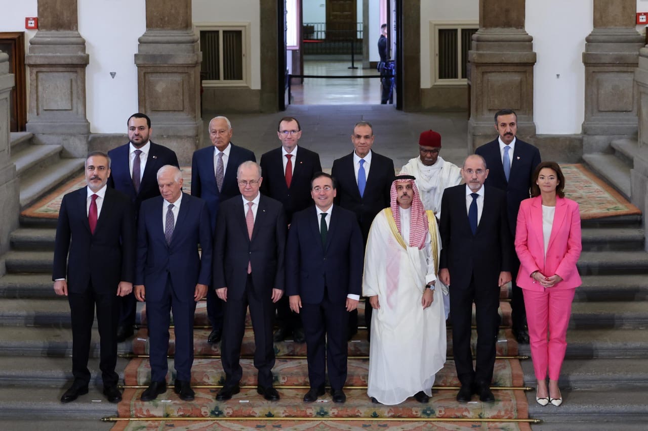 وجاء في البيان، نحن ممثلو مجموعة الاتصال الوزارية المشتركة لجامعة الدول العربية ومنظمة التعاون الإسلامي، من البحرين؛ ومصر، والمملكة الأردنية الهاشمية، وفلسطين، وقطر، والسعودية، وتركيا، وجامعة الدول العربية ومنظمة التعاون الإسلامي؛ ووزراء خارجية وممثلو كل من أيرلندا، والنرويج، وسلوفينيا، وإسبانيا؛ اجتمعنا اليوم في مدريد، في خضم أسوأ أزمة شهدها الشرق الأوسط منذ عقود، للتأكيد على التزامنا المشترك بتنفيذ حل الدولتين باعتباره السبيل الوحيد لتحقيق السلام والأمن الدائمين.