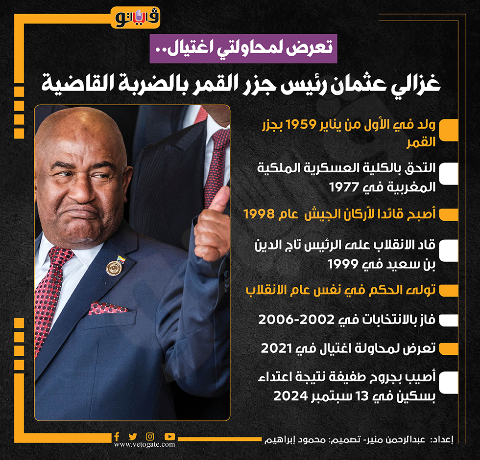 تعرض لمحاولتي اغتيال.. غزالي عثمان رئيس جزر القمر بالضربة القاضية (إنفوجراف) السبت 14/سبتمبر/2024 - 03:01 م 9/14/2024 3:01:07 PM رئيس جزر القمر، فيتو عبدالرحمن منير شارك طباعة 18 حجم الخط شارك طباعة جزر القمر الانقلاب رئيس جزر القمر