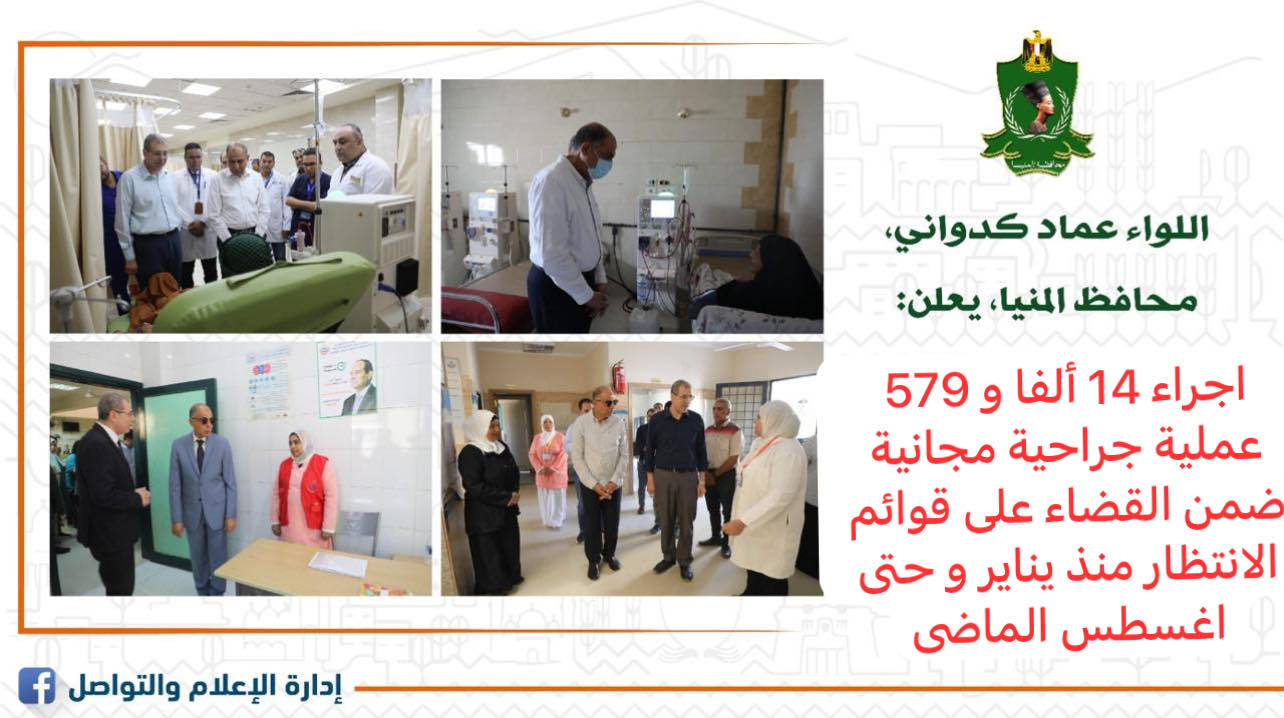 أعلن اللواء عماد كدواني محافظ المنيا، إجراء 14 ألفا و579 عملية جراحية مجانية منذ انطلاق المبادرة الرئاسية، للقضاء على قوائم الانتظار والتي أطلقها رئيس الجمهورية للتخفيف عن كاهل المواطنين، والاهتمام بالصحة العامة لجميع فئات المواطنين على مختلف المراحل العمرية.