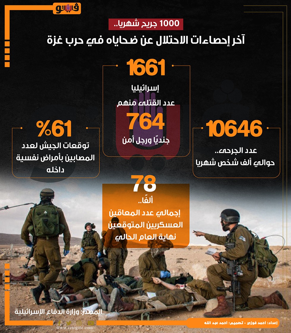 1000 جريح شهريا.. آخر إحصاءات الاحتلال عن ضحاياه في حرب غزة (انفوجراف) الأحد 15/سبتمبر/2024 - 02:00 م 9/15/2024 2:00:37 PM جيش الاحتلال، فيتو احمد فوزي شارك طباعة 18 حجم الخط شارك طباعة الاحتلال إسرائيل أمراض نفسية عدد المصابين وزارة الدفاع المعاقين المصابين