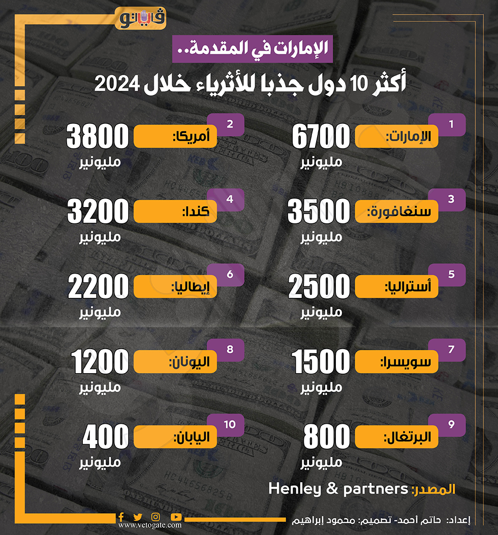 الإمارات في المقدمة.. أكثر 10 دول جذبا للأثرياء خلال 2024 (إنفوجراف) الثلاثاء 17/سبتمبر/2024 - 10:00 ص 9/17/2024 10:00:42 AM أثرياء العالم، فيتو حاتم أحمد شارك طباعة 18 حجم الخط شارك طباعة الأثرياء أثرياء العالم أكثر الدول جذبا للأثرياء الإمارات سنغافورة