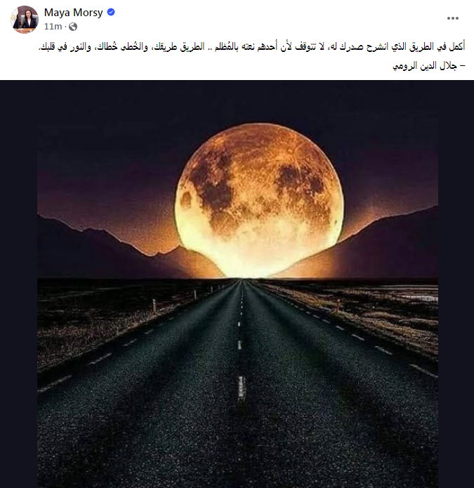 وقالت وزيرة التضامن الاجتماعي الدكتورة مايا مرسي في رسالتها الموجهة للمصريين، عبر منصة "أكس"، تويتر سابقًا: "أكمل في الطريق الذي انشرح صدرك له، لا تتوقف لأن أحدهم نعته بالمُظلم.. الطريق طريقك، والخُطى خُطاك، والنور في قلبك. جلال الدين الرومي"
