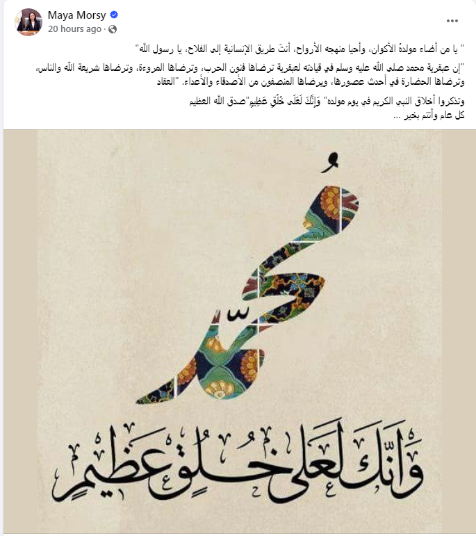 ونصحت مايا مرسي بالتخلق بأخلاق الرسول، صلى الله عليه وسلم، فقالت: "تذكروا أخلاق النبي الكريم في يوم مولده"وَإِنَّكَ لَعَلَى خُلُقٍ عَظِيمٍ"صدق الله العظيم كل عام وأنتم بخير…"