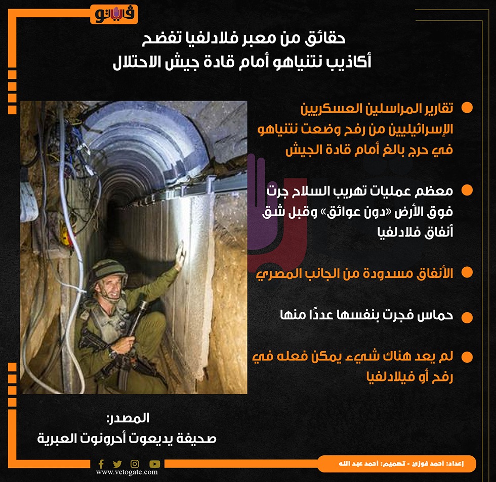 حقائق من معبر فلادلفيا تفضح أكاذيب نتنياهو أمام قادة جيش الاحتلال (إنفوجراف) الإثنين 16/سبتمبر/2024 - 07:29 م 9/16/2024 7:29:55 PM وزير الدفاع الإسرائيلي داخل أحد الأنفاق الحدودية، فيتو احمد فوزي شارك طباعة 18 حجم الخط شارك طباعة نتنياهو المراسلين العسكريين الإسرائيليين أنفاق فلادلفيا فلادلفيا رفح