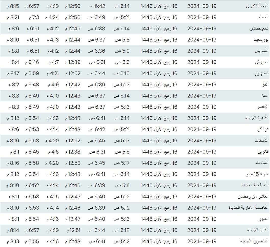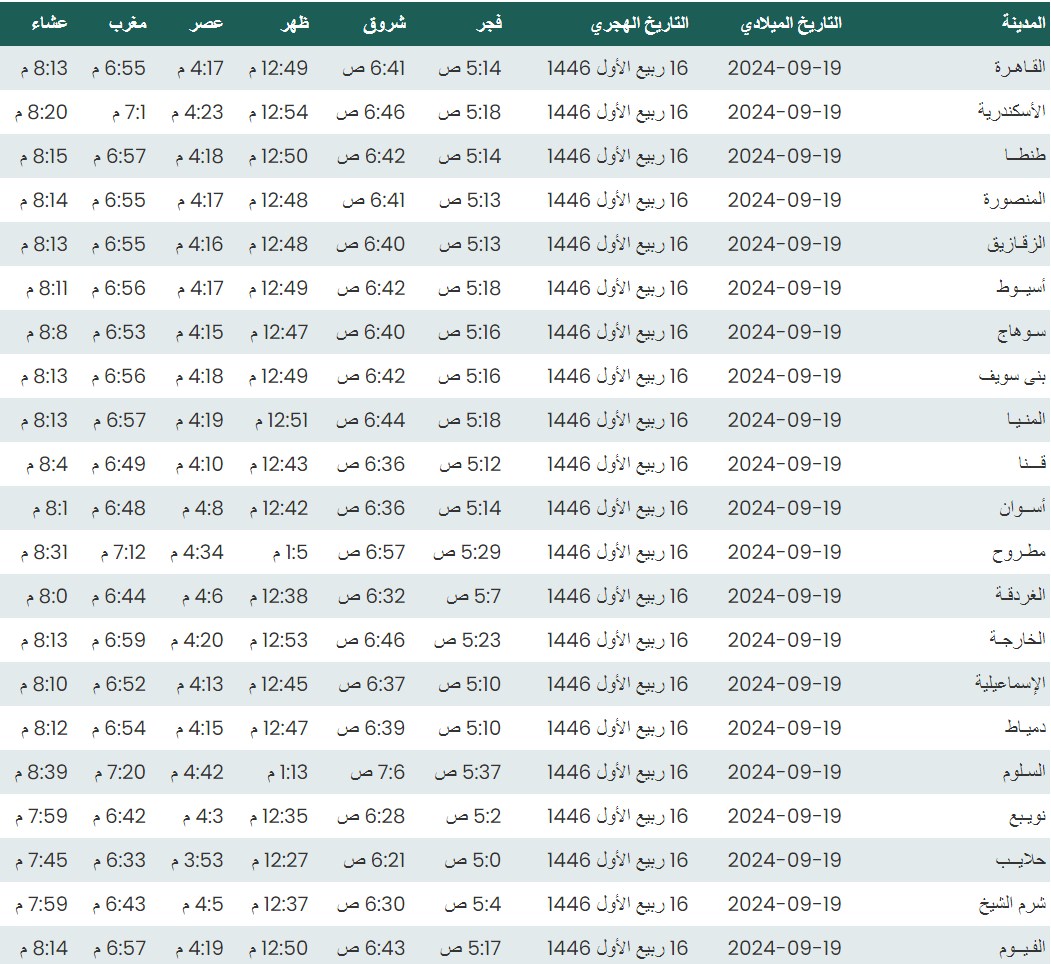 مواقيت الصلاة اليوم وفقًا للتوقيت المحلي لمدينتي القاهرة والإسكندرية وكذلك ،مواقيت الصلاة، لعدد من مدن ومحافظات الجمهورية من واقع بيانات الهيئة العامة للمساحة