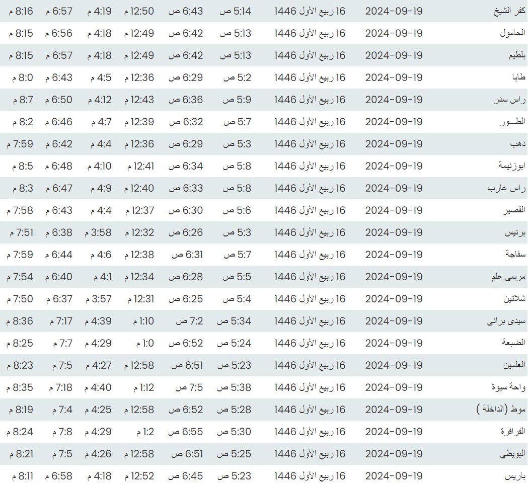 وفيما يلي مواقيت الصلاة، لعدد من مدن ومحافظات الجمهورية من واقع بيانات الهيئة العامة للمساحة