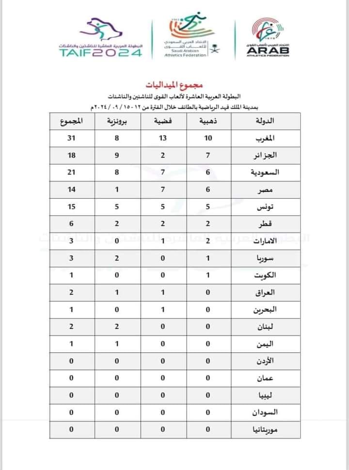 فيما حل المنتخب الجزائري في المركز الثاني بـ18 ميدالية، ثم السعودية بـ21 ميدالية.