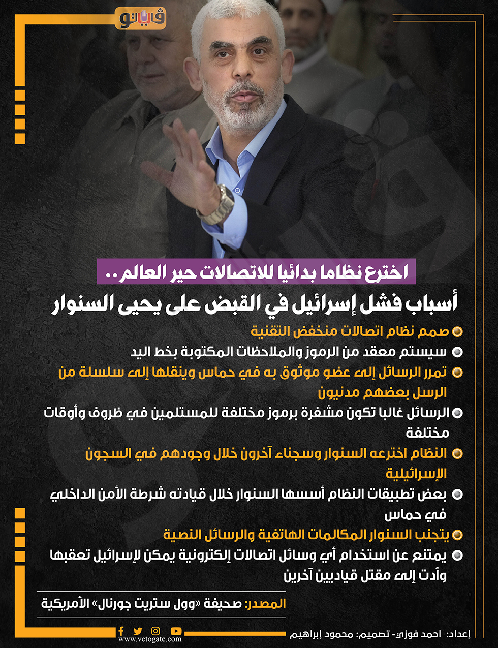 اخترع نظاما بدائيا للاتصالات حير العالم.. أسباب فشل إسرائيل في القبض على يحيى السنوار (إنفوجراف) الثلاثاء 17/سبتمبر/2024 - 11:00 ص 9/17/2024 11:00:01 AM يحيى السنوار، فيتو احمد فوزي شارك طباعة 18 حجم الخط شارك طباعة يحي السنوار صحيفة وول ستريت جورنال وول ستريت جورنال المكالمات الهاتفية الرسائل النصية إسرائيل
