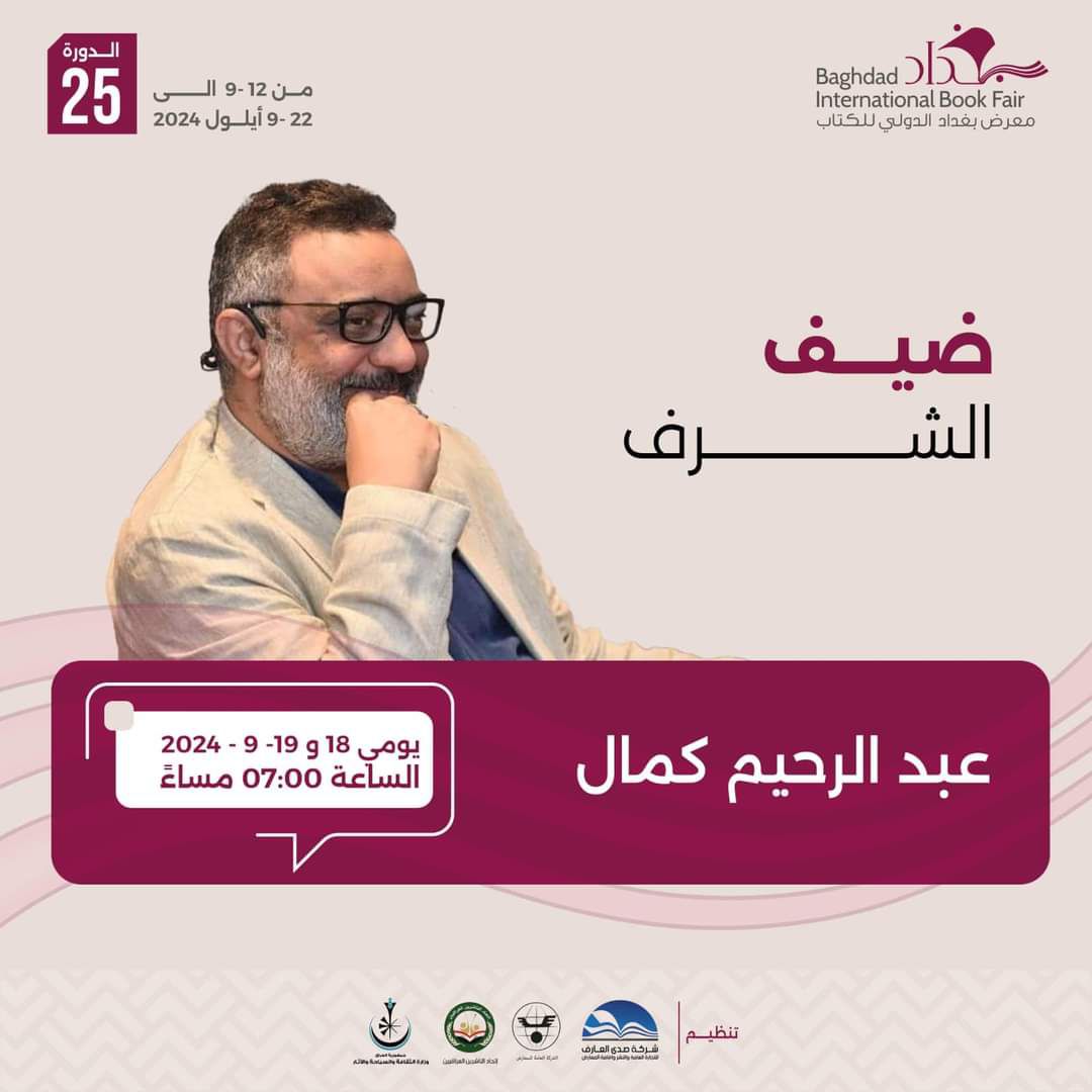 يحل الكاتب والسيناريست عبد الرحيم كمال ضيفا على معرض بغداد الدولي للكتاب فى دورته الــ 25، وذلك يومي 18و19 من شهر سبتمبر الجاري.