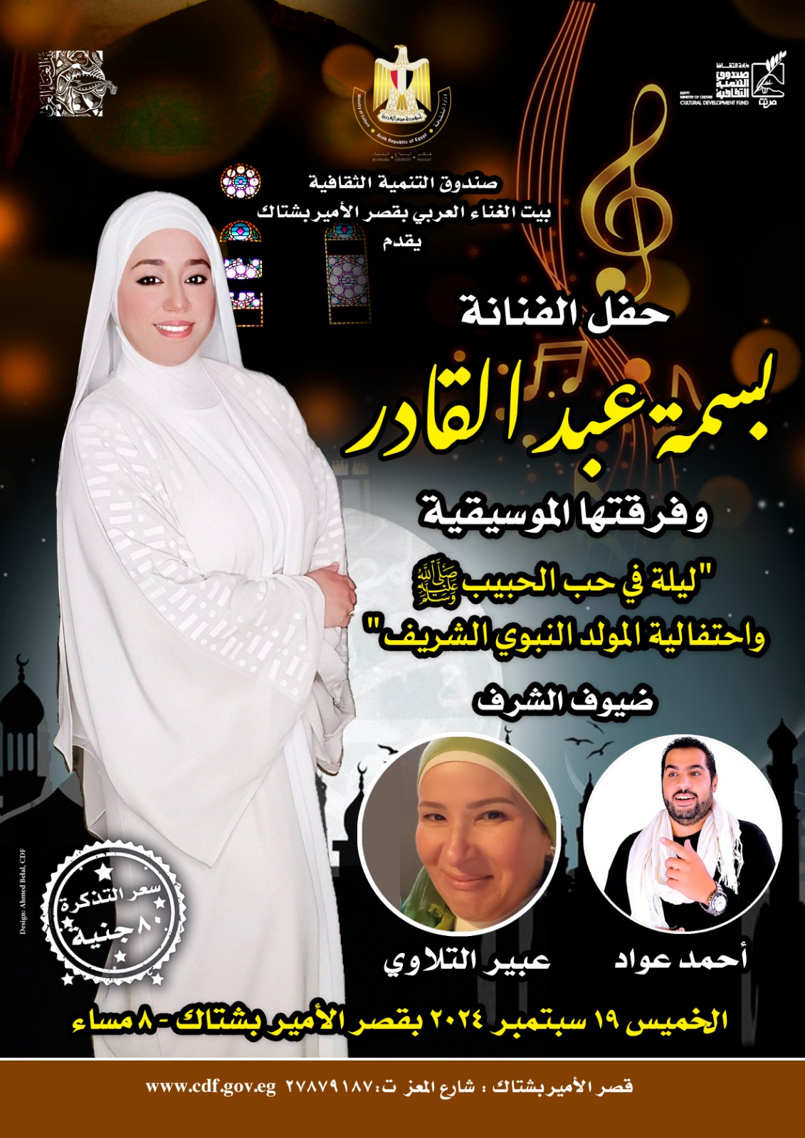 يستضيف بيت الغناء العربي بقصر الأمير بشتاك بشارع المعز التابع لقطاع صندوق التنمية الثقافية برئاسة المعماري حمدي سطوحي في الثامنة مساء الخميس الموافق 19 سبتمبر، حفلا غنائيا جديدا للفنانة بسمة عبد القادر وفرقتها الموسيقية لإحياء ليلة في حب الحبيب المصطفى صل الله عليه وسلم.