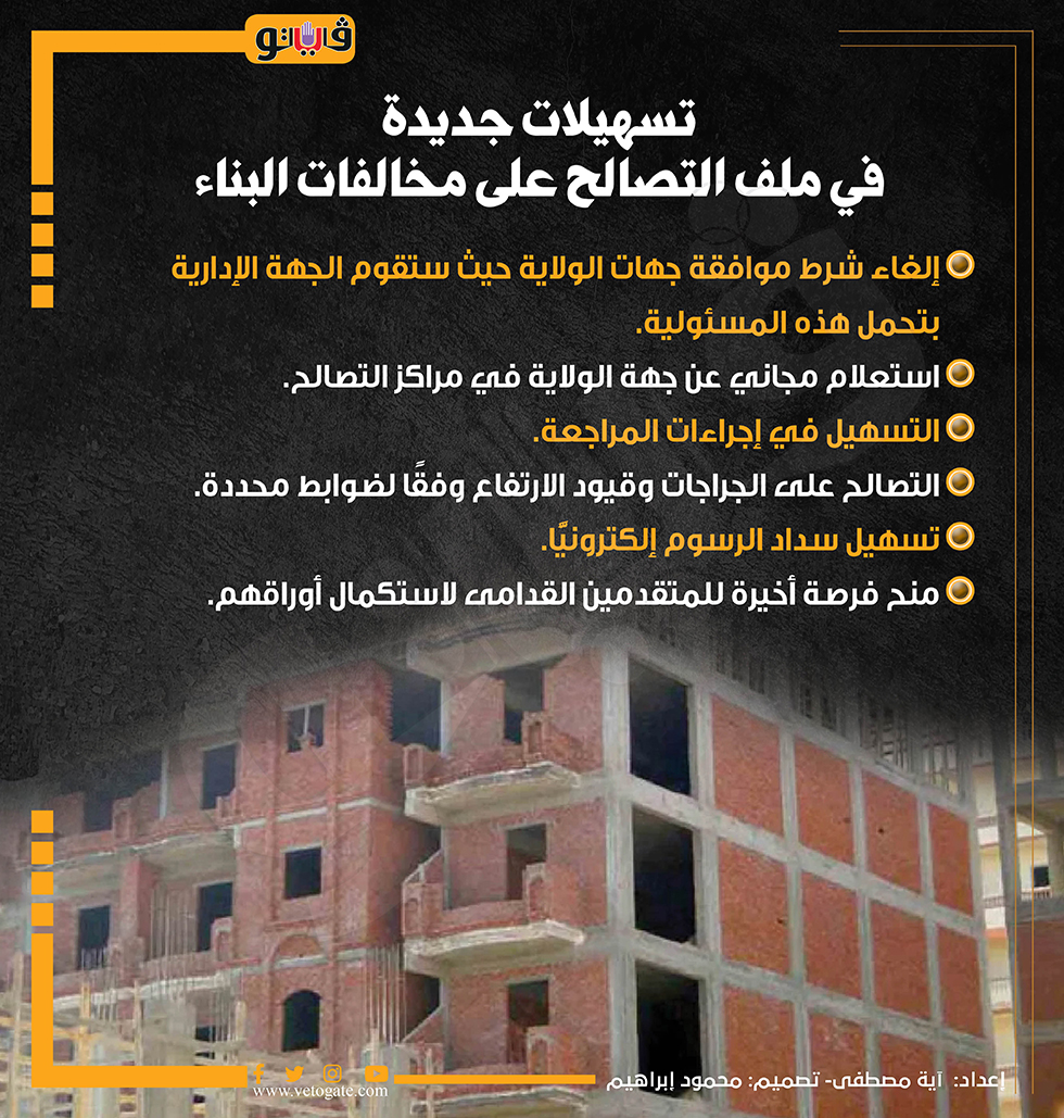 تسهيلات جديدة في ملف التصالح على مخالفات البناء (إنفوجراف) الخميس 19/سبتمبر/2024 - 03:18 م 9/19/2024 3:18:11 PM طلبات التصالح، فيتو آية مصطفى شارك طباعة 18 حجم الخط شارك طباعة مخالفات البناء ملف التصالح قيود الارتفاع التصالح على مخالفات البناء