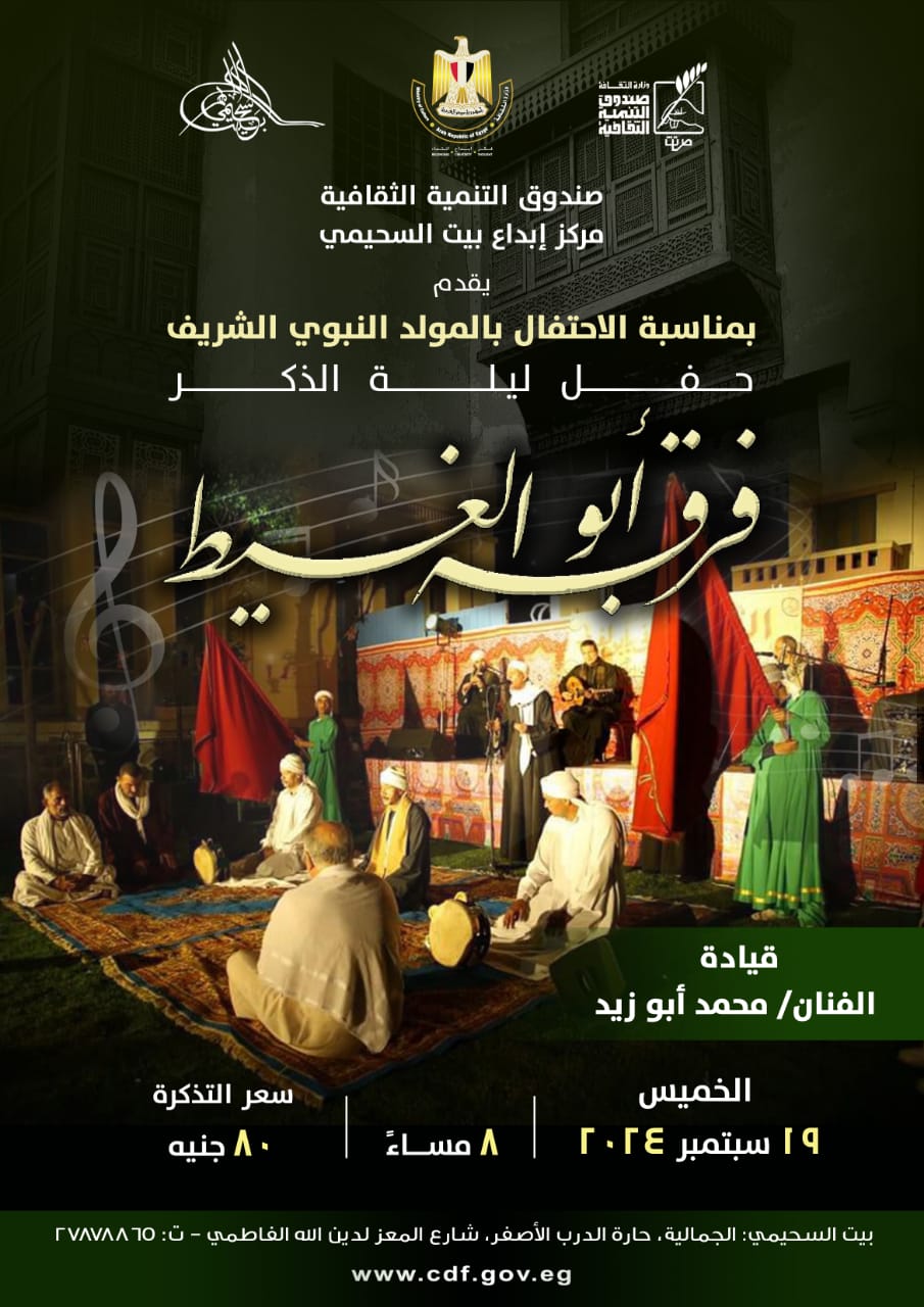 يستضيف مركز إبداع بيت السحيمي بشارع المعز التابع لقطاع صندوق التنمية الثقافية برئاسة المعماري حمدي السطوحي، حفل "ليلة الذكر" لفرقة أبو الغيط بقيادة الفنان محمد أبو زيد، وذلك في الثامنة مساء الخميس القادم، وذلك في إطار الاحتفال بذكرى المولد النبوي الشريف.