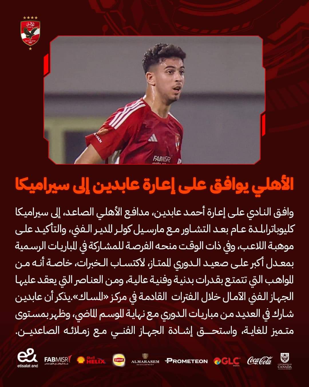 الأهلي، وافق النادي الأهلي، على إعارة أحمد عابدين لاعب الفريق، لسيراميكا لمدة عام بعد التشاور مع مارسيل كولر.