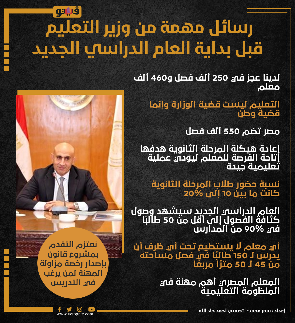 رسائل مهمة من وزير التعليم قبل بداية العام الدراسي الجديد (إنفوجراف) الأربعاء 18/سبتمبر/2024 - 11:26 ص 9/18/2024 11:26:42 AM محمد عبد اللطيف وزير التربية والتعليم سمر محمد شارك طباعة 18 حجم الخط شارك طباعة العام الدراسي الجديد المنظومة التعليمية بداية العام الدراسي الجديد المرحلة الثانوية رخصة مزاولة المهنة وزير التعليم هيكلة المرحلة الثانوية