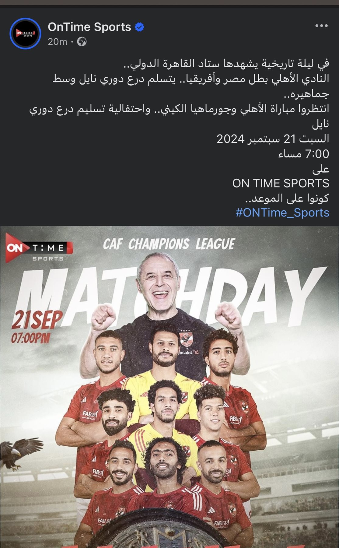 أون تايم سبورتس تعلن إذاعة مباراة الأهلي وجورماهيا بدوري أبطال أفريقيا