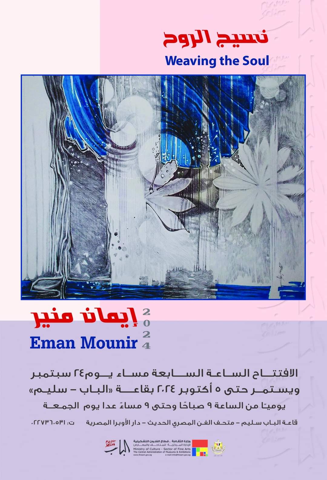 أعلن قطاع الفنون التشكيلية، برئاسة الدكتور وليد قانوش، افتتاح معرض “نسيج الروح” للفنانة إيمان منير يوم الثلاثاء الموافق 24 سبتمبر الجاري بقاعة الباب في رحاب دار الأوبرا المصرية، وذلك تحت رعاية وزير الثقافة أحمد فؤاد هنو.