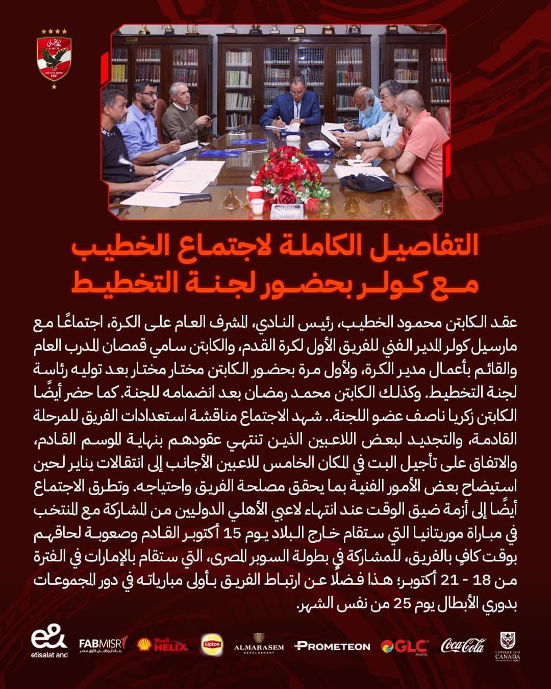 عقد الكابتن محمود الخطيب رئيس النادي الأهلي والمشرف العام على الكرة، اجتماعا مع مارسيل كولر المدير الفني للفريق الأول لكرة القدم بالنادي وسامي قمصان المدرب العام والقائمة بأعمال مدير الكرة، بجانب تواجد مختار مختار للمرة الأولي بعد توليه رئاسة لجنة التخطيط بالإضافة لمحمد رمضان وزكريا ناصف.