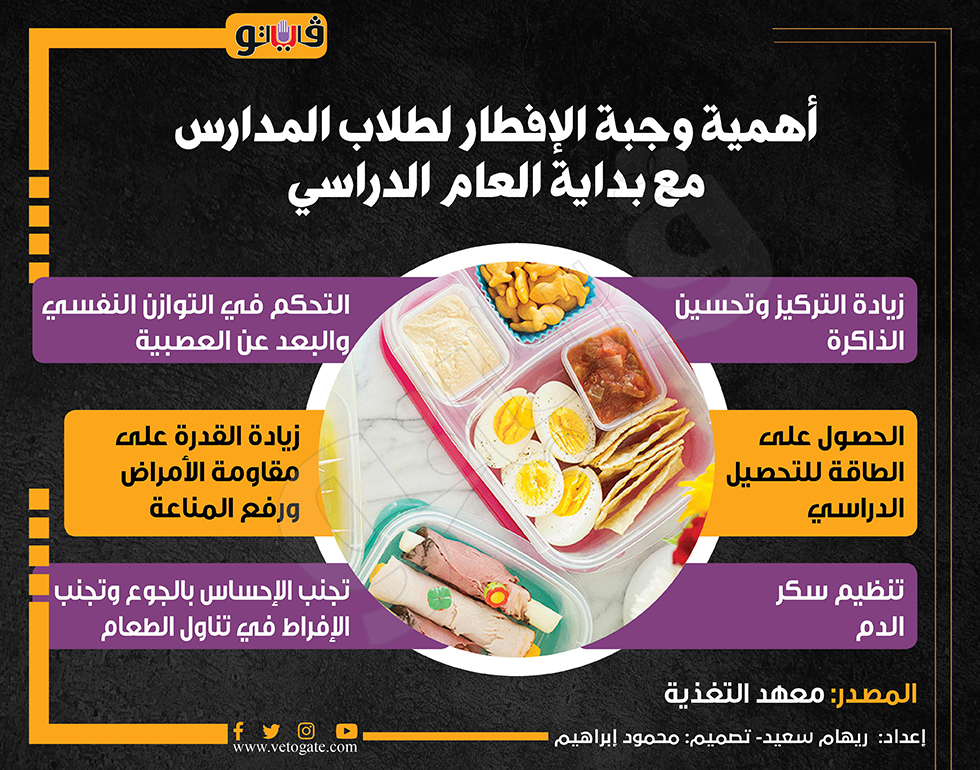 أهمية وجبة الإفطار لطلاب المدارس مع بداية العام الدراسي (انفوجراف) الخميس 19/سبتمبر/2024 - 12:56 م 9/19/2024 12:56:48 PM وجبة الإفطار لطلاب المدارس ريهام سعيد شارك طباعة 18 حجم الخط شارك طباعة الإفراط في تناول الطعام اهمية وجبة الافطار زيادة التركيز تحسين الذاكرة معهد التغذية طلاب المدارس