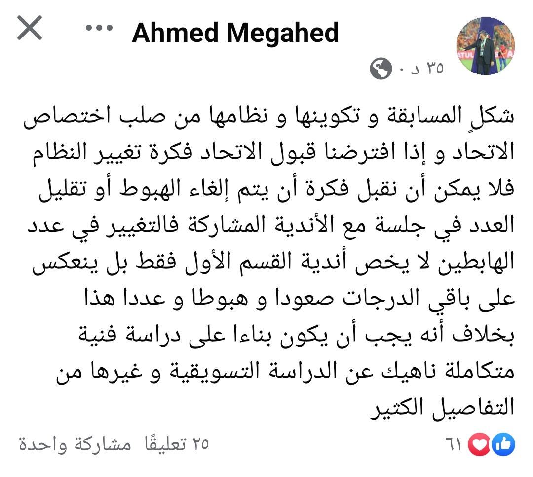 وأكد مجاهد عبر صفحته علي فيس بوك: "شكل المسابقة وتكوينها ونظامها من صلب اختصاص الاتحاد وإذا افترضنا قبول الاتحاد فكرة تغيير النظام فلا يمكن أن نقبل فكرة أن يتم إلغاء الهبوط أو تقليل العدد في جلسة مع الأندية المشاركة فالتغيير في عدد الهابطين لا يخص أندية القسم الأول فقط بل ينعكس على باقي الدرجات صعودا وهبوطا وعددا".