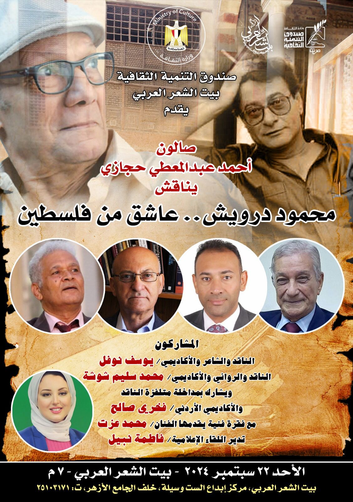 حيث يناقش "حجازي" في هذه الندوة "محمود درويش عاشق من فلسطين" بمشاركة كل من: الناقد والشاعر والأكاديمي يوسف نوفل، والناقد والروائي والأكاديمي محمد سليم شوشة، كما يشارك أيضا بمداخلة متلفزة الناقد والأكاديمي الأردني فخري صالح.
