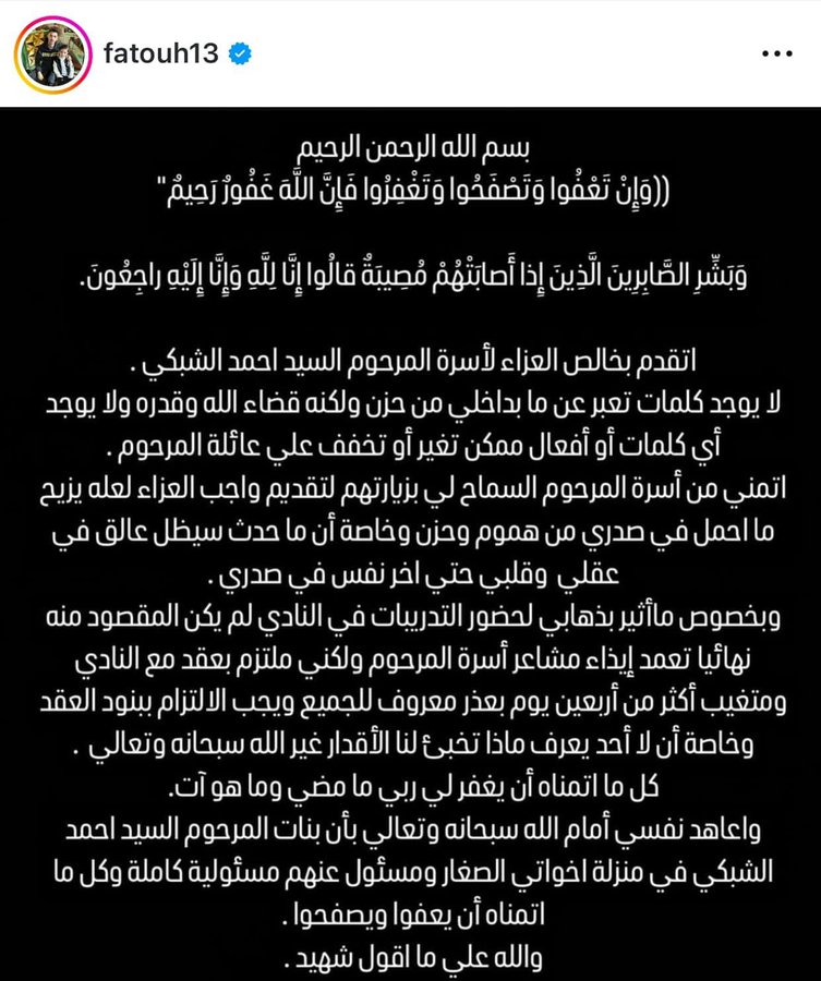وتابع الشحات: “أنا كنت من فترة قريبة لي مشكلة مع الشيبي وكان عليا ضغط ربنا وحده إلا كان عالم بيا وطلعت واعتذرت، ودلوقتي مش عايزين نوصل موضوع أخويا أحمد فتوح لكده ونرجع نقول بعد كده ياريت كنا خفينا عليه، فتوح غلط وقال أنا غلطت، مش لازم نتكلم ونقول لا أنت غلطان ونضغط عليه، أي راجل لما بيطلع يعتذر ويقول أنا غلطان سامحوني أولا دي حاجة كبيرة جدا عند ربنا والراجل طلع وقال أنا غلطان وعايز يروح لأهل الميت ربنا يرحمه يارب ويصبر أهله وأولاده يارب”.