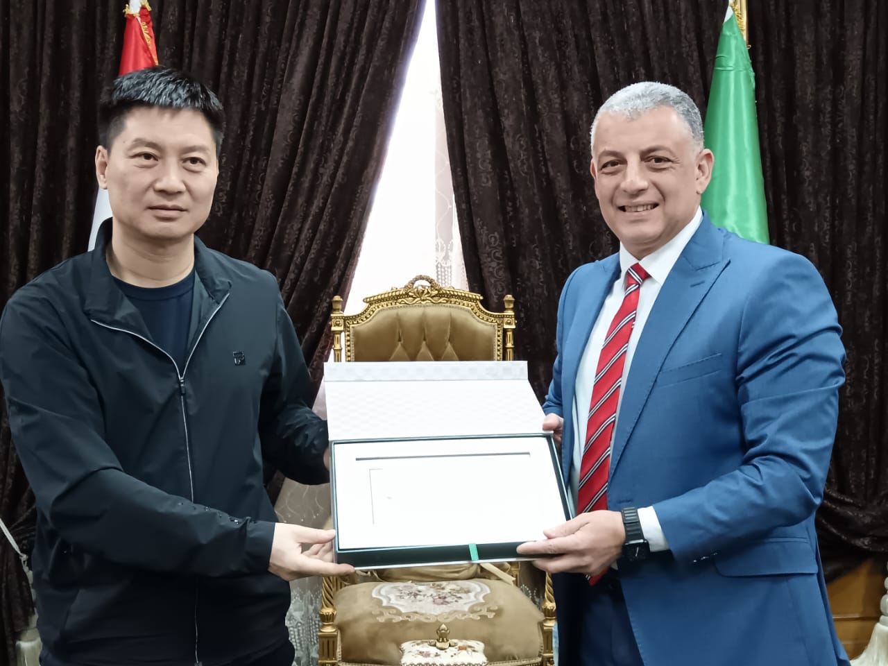 وفي نهاية اللقاء أهدى الوفد الصيني هدية تذكارية للواء طيار أ.ح أكرم محمد جلال محافظ الإسماعيلية، تعبر عن ثقافة وحضارة مدينة "بودنج" الصينية.